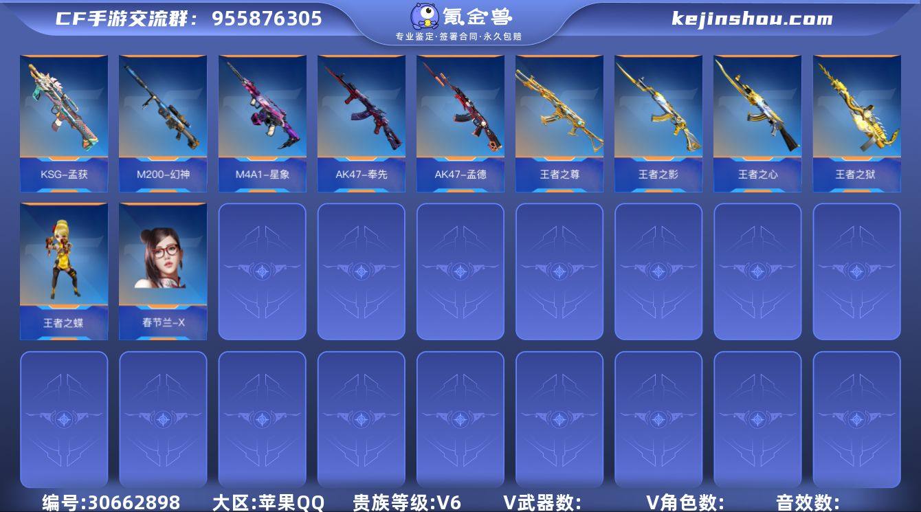 苹果Q☝可修改二次实名☝贵族6☝春节兰-X☝AK47-奉先☝M4A1-星象☝AK47-孟德☝王者之尊☝王者之心☝王者之影☝M200-幻神☝王者之狱☝王者之蝶☝KSG一孟获☝详细见图☝