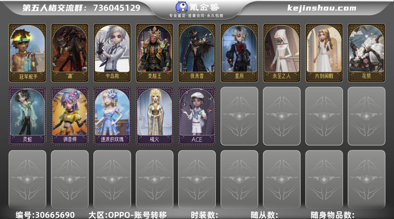 击球手-冠军舵手,“噩梦”-“渊”,佣兵-中岛敦,小丑-变脸王,“杰克”-夜来香,病患-星辰,爱丽丝·德罗斯-未至之人,爱丽丝·德罗斯-片刻闲暇,蜘蛛-花祭,哭泣小丑-灵蛇,调香师-Buffy,调酒师-逐浪的玫瑰,红蝶-硫火,杂技演员-ACE 卖家说:紫皮金皮详情见图片,充了2700多,精品号 绑定还有一个小号有高卷杏,这个平台紫皮识别不了,可以看最后一张截图