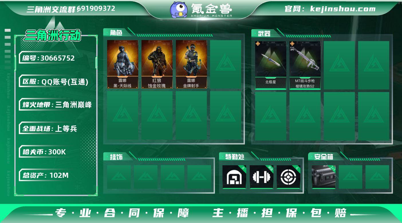实名:不可二次实名 总资产:102M 哈夫币:300K S7高级安全箱(2x3) 烽火地带段位:三角洲巅峰 烽火地带等级:60 全面战场段位:上等兵 全面战场等级:60 8级仓库等级,满级训练中心等级,6级靶场等级 战术部门等级:2 战斗部门等级:3 医疗部门等级:2 研发部门等级:1 后勤部门等级:3 曼德尔砖-棱镜攻势S2:1
