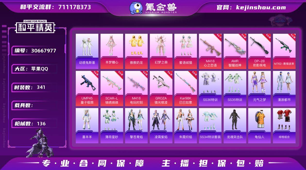 热力值:43680 时装数:341 枪械数:136 战备数:97 游戏等级:54 卓越印记:0 传奇印记:0 绝世印记:0 羊梦糖心,傲傲奶龙,幻梦之森,蜜语绒猫 七级M416-心之恋语,六级AMR-智耀战神,五级DP-28-豹影疾电,五级GROZA-镜光银凌,五级Kar98K-巳巳如意,五级M416-电玩时刻,五级M762-青锋波束,五级SCAR-L-锦绣绵绵,五级UMP45-量子极限 喜羊羊与灰太狼降落伞,幻梦之森降落伞,江南烟雨降落伞,冷漠罗丽降落伞,蜜语绒猫降落伞,赛博古神降落伞,星穹咏叹调降落伞 SS36特训,SS35特训,元气之梦,漫游都市,喜羊羊,薄荷星砂,凌霄紫焰,擎苍青焰,SS34特训套装,朱霞炽焰,暗影哥特,缤纷果语,白光莹,冰公主,滨海厨神,冰河战士,白色伏地魔,雏菊兔兔,长空猛禽,纯真浪花,顶瓜瓜,动感兔斯基,蝶变,大橘大利,绯格组合,粉红小猪,龟仙人,光之冒险,海岛探路者,辉光之湖,黑色伏地魔,黄色运动,湖雨初晴,幻羽潜行,竞技角斗士,竞技名士,坚韧舞者,街头风暴,空岛之星,龙的传人,龙魂突击队,六六大吉,萝兰蝴蝶,黎明保卫者,蓝色运动,莱茵河畔,恋语绒绒,摩登天骄,猛禽,魅力单车,曼妙人鱼,迷雾之月,卖崽青蛙,霓虹街区,破蛋小黄鸡,青团波波,青玉碎影,云朵鹅,荣耀,热情海星,燃烧卡路里,森林游猎者,SS24特训,SS25特训,SS26特训,SS27特训,SS28特训,SS29特训,SS30特训套装,SS31特训套装,SS32特训套装,SS33特训套装,巳巳如意,特殊使命,涂山之恋,糖糖葫芦,特战英豪,先驱飞行员,雪绒豹,香桃花海,星途旅人,小熊娃娃,星渊小夜曲,玉兔迎春,焰鹰斗篷,鱼渊荷华,幽夜迷踪,燕燕于飞,异域银装,智谋强哥 PKM-啾咪啾咪,MK12-乌木金纹,AKM-霓彩脉冲,S12K-霓彩脉冲,SCAR-L-彩虹符号,AKM-涂鸦街区,AUG-紫晶流影,Mini14-鸡智如我,AMR-喜羊羊与灰太狼,爆炸猎弓-喜羊羊与灰太狼,电击枪-喜羊羊与灰太狼,P90-玩趣呆呆,AA12-G-纯真浪花,AKM-龙的传人,AKM-霓虹街区,AKM-破晓战魂,AKM-荧星灵猫,AKS-74U-鬼刀,AKS-74U-鸡智如我,ARX-凌霄紫焰,AUG-天降萌叽,AUG-耀粉歌者,AWM-纯真浪花,AWM-焰鹰斗篷,DBS-焰鹰斗篷,大砍刀-云朵鹅,DP-28-焰鹰斗篷,G36C-星穹咏叹调,GROZA-海盐豹豹,JS9-凌霄紫焰,Kar98K-红色方程式,Kar98K-星穹咏叹调,M16A4-冰河战士,M16A4-红色方程式,M200-乌木金纹,M249-彩虹符号,M249-金丰海韵,M249-破晓战魂,M416-红色方程式,M416-糯团青竹,M417-玩趣呆呆,M762-彩虹符号,M762-雏菊兔兔,M762-云朵鹅,MG-36-凌霄紫焰,MG3-幻世战舞者,蜜獾-天降萌叽,蜜獾-幻梦之森,蜜獾-糖糖葫芦,Mini14-耀粉歌者,Mini14-雏菊兔兔,Mini14-涂山之恋,Mini14-香桃花海,Mk14-冰河战士,MK20-H-星途旅人,MK20-H-狂鲨锋刃,MK20-H-糖糖葫芦,莫辛纳甘-蜜语绒猫,P18C-糖糖葫芦,P90-巳巳如意,P92-凌霄紫焰,平底锅-雏菊兔兔,平底锅-纯真浪花,平底锅-凌霄紫焰,平底锅-糖糖葫芦,平底锅-焰鹰斗篷,破片手榴弹-巳巳如意,破片手榴弹-星途旅人,QBZ-彩虹符号,QBZ-纯真浪花,R1895-雏菊兔兔,S12K-玩趣呆呆,S1897-糯团青竹,S686-彩虹符号,S686
