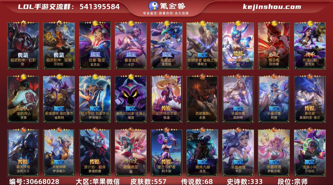 皮肤数:557 典藏皮肤数量:2 神话皮肤数量:13 传说皮肤数量:68 史诗皮肤数量:333 超武乾坤:虹影,超武乾坤:征服 狂潮·裂变 金克丝,暮星追影,夜星流火 金克丝,黎明使者 破晓之殇 佛耶戈,臻藏 翩翩绣蕊 霞,蝶恋春女警,光谱幻影金克丝,龙的传人,星域游侠卡牌圣时豪杰,战斗学院EZ白金学长,最终BOSS里·大魔王维迦 段位:宗师 卖家说:带和平和金铲铲连体 和平有木乃伊