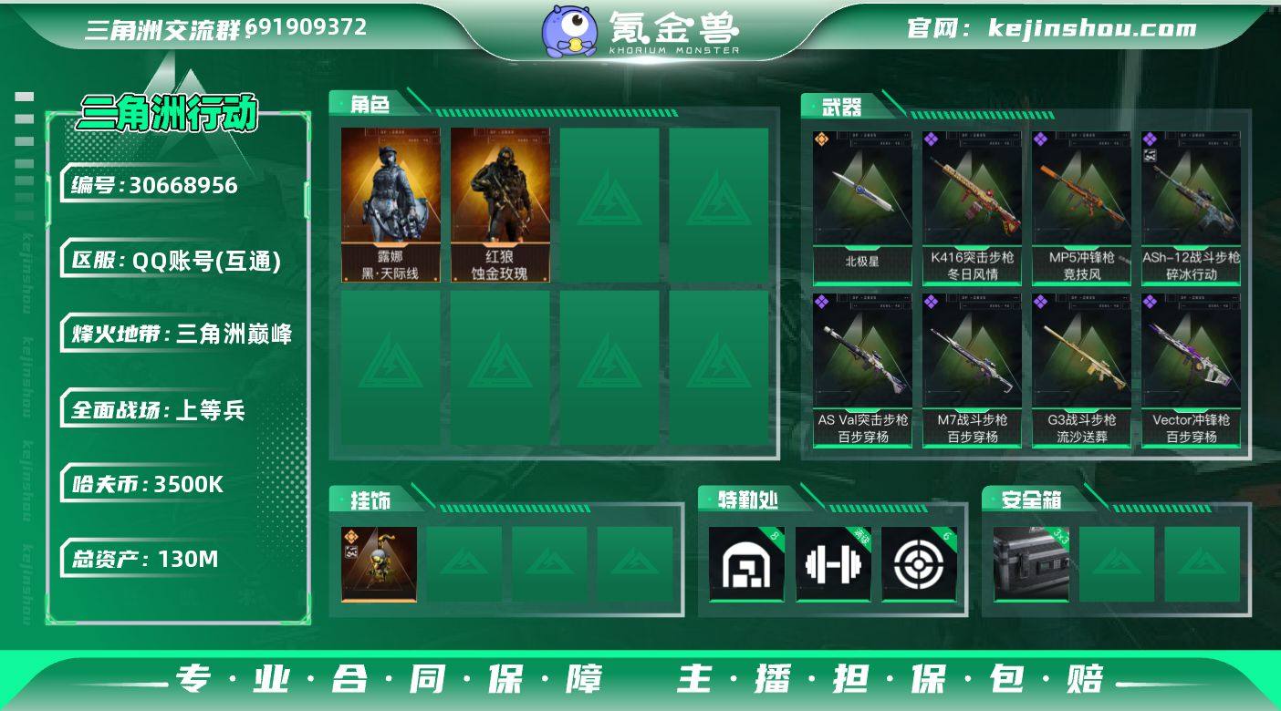 实名:不可二次实名 总资产:130M 哈夫币:3500K S7顶级安全箱(3x3) 烽火地带段位:三角洲巅峰 烽火地带等级:60 全面战场段位:上等兵 全面战场等级:60 8级仓库等级,满级训练中心等级,6级靶场等级,4级指挥中心等级,0级潜水中心等级,满级防具台等级 战术部门等级:3 战斗部门等级:3 医疗部门等级:3 研发部门等级:3 后勤部门等级:3