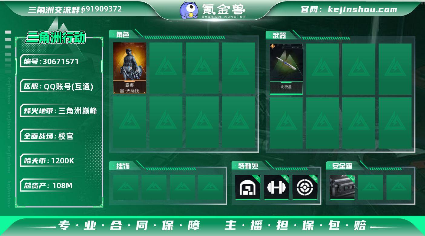 实名:可二次实名 总资产:108M 哈夫币:1200K S7顶级安全箱(3x3) 烽火地带段位:三角洲巅峰 烽火地带等级:60 全面战场段位:校官 全面战场等级:60 8级仓库等级,满级训练中心等级,满级靶场等级,满级指挥中心等级,满级潜水中心等级,满级防具台等级 曼德尔砖-棱镜攻势S2:1