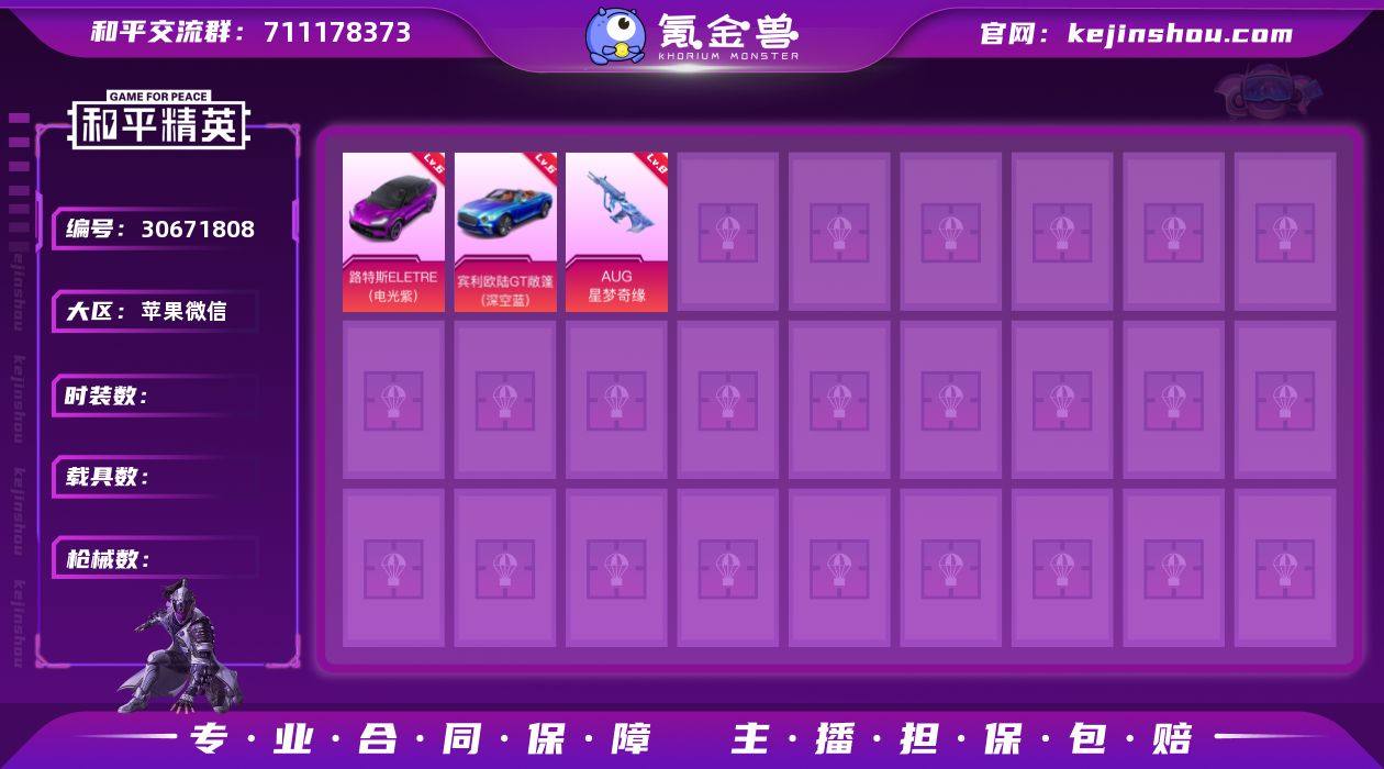 热力值:257332 载具数:23 时装数:1274 枪械数:476 战备数:325 游戏等级:77 卓越印记:14 传奇印记:14 绝世印记:14 六级路特斯ELETRE(电光紫),三级路特斯EVIJA(电光紫) 2号机款机体服,傲雪凌霜,暗夜玫瑰,宝贝奶油派,缤纷油彩,薄荷物语,冰霜白皇,初号机款机体服,彩虹甜喵,草莓生巧,潮汐统领,炙焰红王,炙焰牛王,蝶舞迷情,复仇流浪者,翡翠骑士,放客神游,粉色回忆,扶摇飞仙,怪诞乔克,幻彩马卡龙,黄蜂伯爵,寒光使者,花间之火,酣梦娃娃,彗云及圣,海盐物语,幻影战神,静灵氛围,精灵娃娃,焦糖拿铁,霁雪冰心,锦绣火鲤,极致幻想,恐龙拽拽,灵感创作师,琉璃脉冲,岚岚物语,洛天依,流星咚咚,迷蝶贵族,梦幻火箭,蜜桃特工,暖熊萌萌,千面幻镜,启明星,绒雪飘舞,深海曼妙,天使彩虹糖,相思残雪,闪耀律动,狩月元帅,天禅智恒,甜梦冰蝶,甜蜜誓约,甜梦小狐,童趣迷兔,甜心巧克力,甜心娃娃,天之羽翼,未来战士,王牌四分卫,馨动时刻,雪国幻梦,霞光圣骑,星空之魅,心之恋语,香水柠檬,新星烈龙,旋转彩虹,星之信仰,烟云彩露,吟月归客,智能音符,庄周梦蝶 七级AUG-妙趣可丽,七级DP-28-幻梦音符,七级Groza-香水柠檬,七级M249-彩虹甜喵,七级M416-暖熊萌萌,七级M762-甜蜜誓约,七级MG3-洛神天依,七级平底锅-林间仙鹿,七级SCAR-L-甜梦小狐,七级UMP45-相思残雪,七级UZI-绮梦青鸾,七级Vector-环太平洋,六级AWM-花间之火,五级AKM-百合蜜语,五级Mini14-荧光虫舞,五级VSS-烈焰拳霸,四级DP-28-豹影疾电,四级Kar98K-伏魔团,四级Kar98K-巳巳如意,四级SLR-暗夜玫瑰,二级M762-甜心娃娃,一级AKM-炫紫旋律,一级DP-28-扶摇飞仙,一级GROZA-旋转彩虹,一级M416-风花雪月,一级M416-心之恋语,一级SCAR-L-梦幻火箭,一级UMP45-恐龙拽拽 一级快艇-塞莎KL27(霓虹粉),阿斯顿·马丁DBS(金),特斯拉Roadster(尊享铂),合金龙骨(红),兰博基尼Aventador SVJ(翡翠绿),阿斯顿·马丁DBX(橙),阿斯顿·马丁DBS(红),阿斯顿·马丁DBS(绿),阿斯顿·马丁DBX(蓝),鬼马风驰,合金龙骨(蓝),合金龙骨(绿),极速兔兔车,路特斯EVIJA(星际黄),萌喵橘座,玛莎拉蒂Ghibli(粉),俏皮小熊猫,双人摩托-双刃魅影(绿),特斯拉Cybertruck(荒芜蓝),特斯拉Model 3(冷光银),特斯拉Roadster(沁心粉) 僚机-萌兔起飞,空客H135-蔚蓝之翼,炫彩糖果降落伞,炫彩糖果飞行器,暗翼战神飞行器,BEARBRICK飞行器,春暖花开飞行器,伏魔团飞行器,锦绣火鲤飞行器,激战未来飞行器,梦幻火箭飞行器,千面幻镜飞行器,绮梦青鸾飞行器,齐天大圣飞行器,神秘黑猫飞行器,天之羽翼飞行器,王牌四分卫飞行器,夏日绵绵冰飞行器,相思残雪飞行器,星夜魔法师飞行翼,星之彼岸飞行器,心之恋语飞行器,庄周梦蝶飞行器,阿狸红降落伞,暗夜玫瑰降落伞,百合蜜语降落伞,百万伏特降落伞,碧影闪光降落伞,彩虹甜喵降落伞,垂柳戏鸭降落伞,春暖花开降落伞,潮汐统领降落伞,风花雪月降落伞,繁花小夜曲降落伞,粉色回忆降落伞,扶摇飞仙降落伞,古堡领主降落伞,怪笑疯兔降落伞,古战神甲降落伞,花间之火降落伞,葫芦兄弟降落伞,环太平洋降落伞,锦绣火鲤降落伞,橘柚倾心降落伞,激战未来降落伞,恐龙拽拽降落伞,临安公主降落伞,灵感创作师降落伞,洛神天依