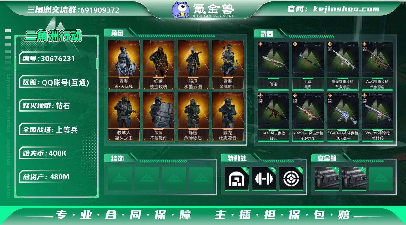 实名:可二次实名 总资产:480M 哈夫币:400K S7顶级安全箱(3x3),S7高级安全箱(2x3) 烽火地带段位:钻石 烽火地带等级:60 全面战场段位:上等兵 满级仓库等级,满级训练中心等级,满级靶场等级,满级指挥中心等级,2级潜水中心等级,满级防具台等级 战术部门等级:4 战斗部门等级:4 医疗部门等级:4 研发部门等级:4 后勤部门等级:4