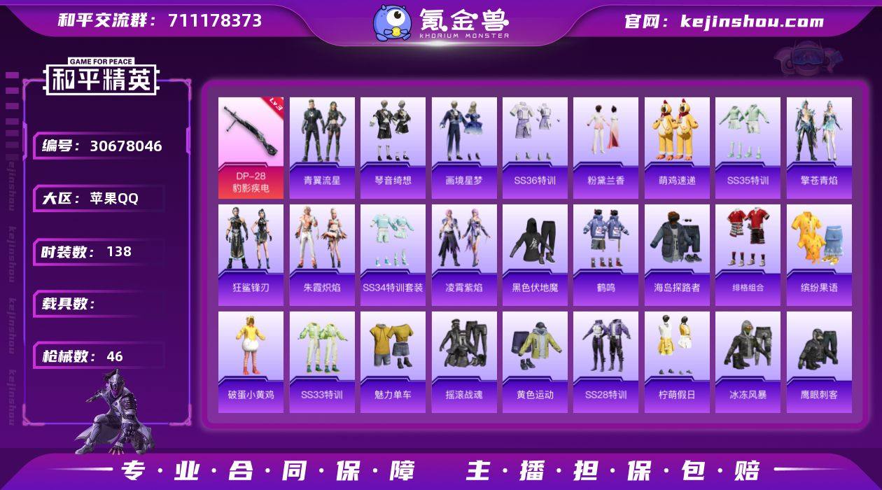 热力值:14578 时装数:138 枪械数:46 战备数:44 游戏等级:44 卓越印记:1 传奇印记:0 绝世印记:0 三级DP-28-豹影疾电 绝对恒星降落伞,极意拳锋飞行器,炫彩糖果降落伞,炫彩糖果飞行器,幻影战神降落伞 青翼流星,画境星梦,琴音绮想,SS36特训,炫彩糖果,粉黛兰香,萌鸡速递,SS35特训,狂鲨锋刃,凌霄紫焰,擎苍青焰,SS34特训套装,朱霞炽焰,冰冻风暴,缤纷果语,白色伏地魔,长空猛禽,蝶变,绯格组合,海岛探路者,鹤鸣,黑色伏地魔,黄色运动,街头风暴,魅力单车,柠萌假日,破蛋小黄鸡,SS28特训,SS29特训,SS30特训套装,SS31特训套装,SS33特训套装,摇滚战魂,鹰眼刺客 ACE32-冰晶雪宝,Mk14-阳光菠萝,AA12-G-画境星梦,ACE32-画境星梦,M1加兰德-画境星梦,MK12-乌木金纹,MP5K-画境星梦,平底锅-画境星梦,S12K-极意拳锋,铝热弹-炫彩糖果,UZI-炫彩糖果,撬棍-冰晶雪宝,Famas-霓彩脉冲,SLR-霓彩脉冲,信号枪-异瞳寒姬,破片手榴弹-拽到爆炸,S12K-霓彩脉冲,SCAR-L-彩虹符号,MG-36-薄荷星砂,ARX-凌霄紫焰,AUG-幻影战神,Famas-突变脉冲,GROZA-影袭,JS9-凌霄紫焰,Kar98K-幻影战神,M16A4-冰河战士,M762-天降萌叽,M762-甜心宝贝,MG-36-凌霄紫焰,蜜獾-精灵梦叶罗丽,Mini14-香桃花海,MK20-H-星途旅人,MK20-H-狂鲨锋刃,P92-凌霄紫焰,平底锅-凌霄紫焰,SCAR-L-炫彩节奏,SPAS-12-狂鲨锋刃,UZI-天降萌叽 画境星梦降落伞,SS36王牌降落伞,登顶巅峰飞行器,SS35王牌降落伞,狂鲨锋刃飞行器,都市猎人降落伞,海域冒险降落伞,凌霄紫焰降落伞,SS34王牌降落伞 实名:不可二次实名