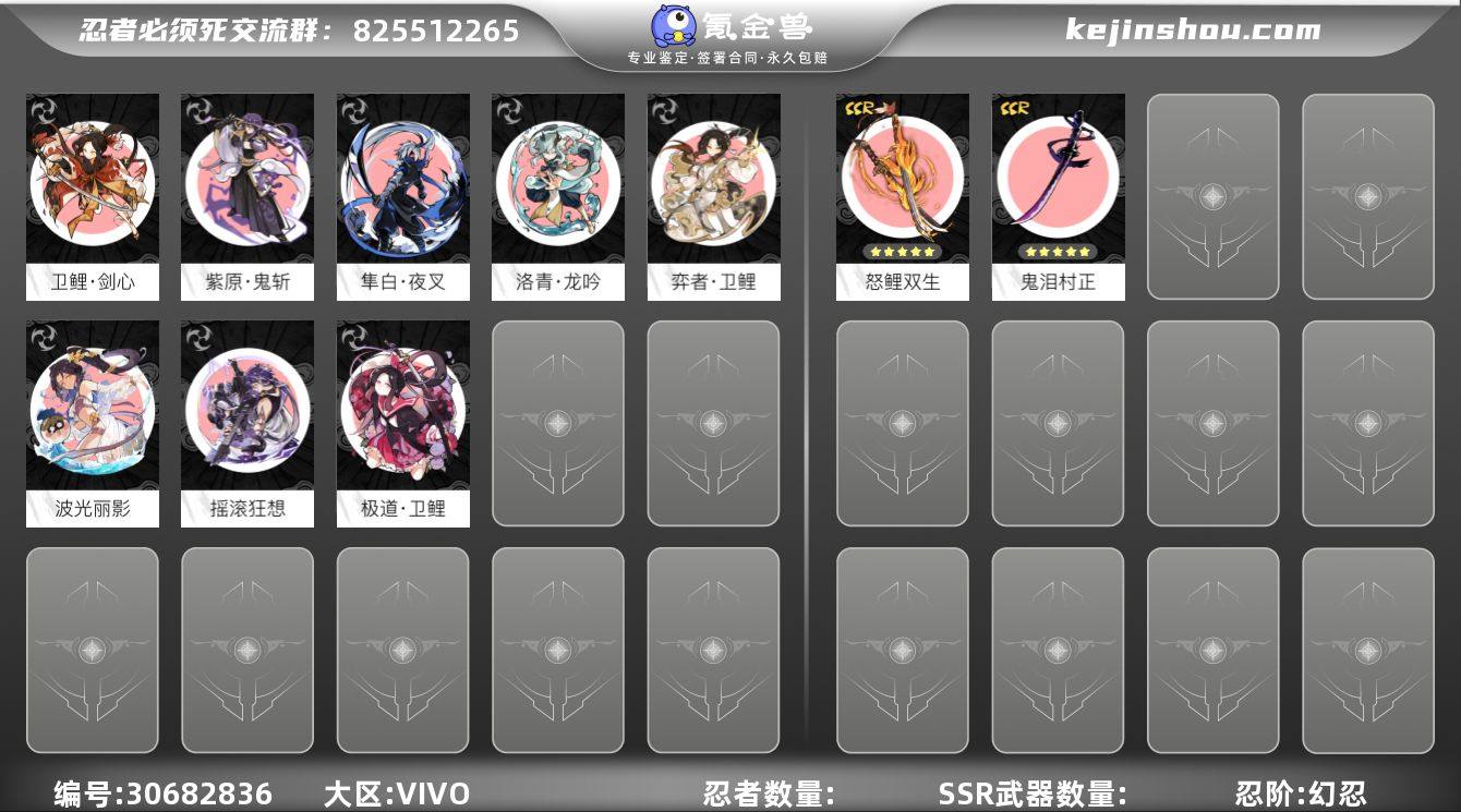 忍阶:幻忍 二命隼白·夜叉,六命洛青·龙吟,六命卫鲤·剑心,五命紫原·鬼斩 波光丽影,极道·卫鲤,摇滚狂想,弈者·卫鲤 五星怒鲤双生,五星鬼泪村正 卖家说:幻忍,6命剑心,6命龙吟,4命鬼斩,4命奔雷,1命猫太,1命冰羽,等,4把五级五星武器,详情看图;【安卓】【vivo服】(号主备注:6命卫鲤3+3,6命洛青3+3,5命紫原3+3,2命隼白单1,vivo1区,全部信息都可以换绑,安卓都可以下载vivo游戏中心登录)