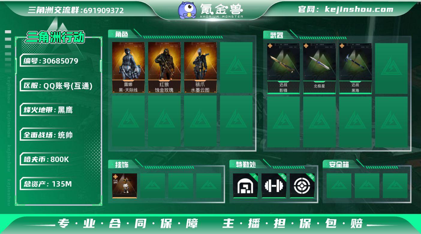 实名:不可二次实名 总资产:135M 哈夫币:800K 烽火地带段位:黑鹰 全面战场段位:统帅 8级仓库等级,满级训练中心等级,满级靶场等级,满级指挥中心等级,1级潜水中心等级,满级防具台等级
