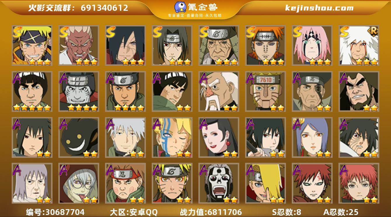 区服:3904区 实名:不可二次实名 贵族等级:V7 战力值:6811706 S忍数:8 A忍数:25 三星漩涡鸣人·宇智波佐助,三星艾「忍界大战」,三星宇智波斑「秽土转生·解」,三星宇智波鼬「须佐能乎」,三星猿飞日斩「秽土转生」,三星佩恩「天道」,三星春野樱「忍界大战」,三星自来也「舞之豪杰」 五星迈特凯,四星干柿鬼鲛,四星猿飞阿斯玛,二星迈特凯「青春爆炸」,二星大野木「侠隐江湖」,二星机械鸣人「初始形态」,二星土台「忍界大战」,二星神农「羁绊」,二星宇智波泉奈,二星黑绝,二星旗木卡卡西「幻之真容」,二星漩涡博人「桃式显现」,二星不缘,二星宇智波佐助「须佐能乎」,二星小南「新春限定」,二星宇智波带土「暴怒」,二星千代「近松十人卫」,二星药师兜「半蛇斗篷」,二星秋道丁次「忍界大战」,二星漩涡鸣人「仙人模式」,二星飞段「死司凭血」,二星迪达拉,二星我爱罗「疾风传」,二星蝎,二星宇智波鼬 卖家说:有黑绝的号有90片秽土柱间和30片秽土角都