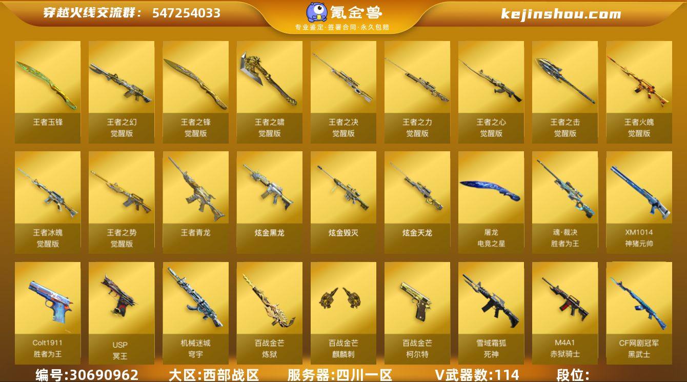 西部战区(四川一区)ys【精美爆破生化挑战全号】【挑战九阶全满+BOSS卡89】三传说【传说艾莉莎,传说光耀,传说夜影】114v【幻神套装+四皮/冠军之幻/CFS2022/丹凤/黄忠,竞技荣光套装,Kar98K-星神+皮/璀璨,荣耀世冠套装,动感闪耀套装,CF网剧冠军套装,柯尔特-冠军之特,Knife-冠军之刃*2,QBZ03-金色蔷薇+双皮/冠军之薇/枪娘阿敏,QBZ03-天罚,白虎之魄,白虎-电玩蓝兔,HK417-朱雀,AWM-裁决+皮/运输船,5盘龙+炼狱-迷你小钢,COP357-雷霆,COP-堕天神,柯尔特-电竞装甲,柯尔特-竞技荣光,柯尔特-百战金芒,USP-冥王,荣耀世冠-柯尔特,QBZ03-吕布,黄金猫猫手套,黄金猫猫手套-白鲨,金刚伞-电玩红兔,猫猫手套,双面神,KAC-狂怒咆哮,黄金迷你深渊冰龙】13王者【王者之心,王者冰魄,王者火魄,王者青龙,王者之幻,王者之势,王者之决,王者之力,王者凛烈,王者玉峰,王者之锋,王者之击,王者之啸】5炫金【炫金黑龙,炫金毁灭,炫金天龙】23角色【四防传说艾莉莎,四防电竞教官-云悠悠,四防荒漠琉璃,四防兰-巾帼英雄,四防王者炽天使,四防王者零-华冠丽服,四防王者凌霄,四防王者沙漠玫瑰,四防王者涂鸦,关小雨,迷迭香,妮妮,枪娘樱,魅影,零-纪元,幻面灵狐,葵-阿尔法武装,乔伊教练,王者瞳-闭月羞花,王者玲珑,修道士,雪域霜狐,云海玲珑,四防暗夜审判,职业选手】16音效【M200-幻神音效卡,AK47-火麒麟音效卡,屠龙-动感闪耀音效卡,Barrett-极光音效卡,Barrett-毁灭音效卡,M4A1-黑骑士音效卡,M4A1-雷神音效卡,炼狱-百战金芒-庆典舞曲音效卡,Barrett-碧霄极光音效卡,屠龙-电竞之星-竞星悦动音效卡,死神-雪域霜狐-怀旧音效卡】59皮【幻神-冠军之幻,幻神-CFS2022,幻神-丹凤,幻神-黄忠,星神-璀璨,黑骑士-白马银枪,雷神-烈虎,火麒麟-枪娘凯撒琳,火麒麟-傲竹金蛇,黑骑士-...