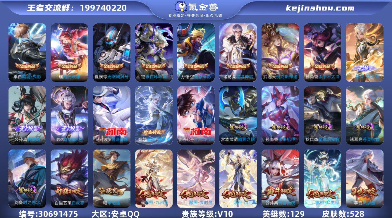 可立即换绑13410七国标怪盗基德 马可波罗,器灵·落星盏 嫦娥,江户川柯南 鲁班七号,【8 典藏皮肤】鸣剑·曳影 李白,全息碎影 孙悟空,杀手不太冷 孙尚香,倪克斯神谕 武则天,银白咏叹调 铠,无限飓风号 夏侯惇,星域神启 诸葛亮,拾光映像 瑶,【3 无双皮肤】离恨烟 公孙离,群星魔术团