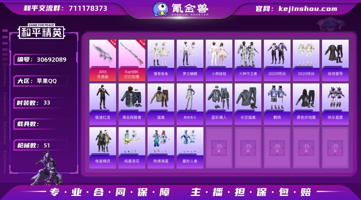 苹果【小号 角色-罪夜之冕/ARX-无垠阁(五级)/Kar98K-巳巳如意(五级)/套装-雏菊兔兔/创世·救赎降落伞/套装-萝兰蝴蝶】 手Q-1粉装-2特效枪-0载具-0粉色飞行器-14494热力值-1王牌印记-33套装-51枪皮 【粉色套装】:角色-罪夜之冕 【粉色枪皮等级】:ARX-无垠阁(五级),Kar98K-巳巳如意(五级) 【粉色枪皮】:ARX-无垠阁,Kar98K-巳巳如意 【粉色降落伞】:创世·救赎降落伞,赛博古神降落伞,樱桃泡泡降落伞,荧海星豚降落伞 【稀有套装】:套装-雏菊兔兔,套装-萝兰蝴蝶,套装-小熊娃娃,套装-火种守卫者 【稀有枪皮】:SCAR-L-炫彩节奏,QBZ-彩虹符号,QBZ-洛神天依,M762-天降萌叽,AC-VAL-天降萌叽,Vector-生命誓言,Vector-创世·救赎,Mini14-耀粉歌者,S1897-荧海星豚,S12K-玩趣呆呆,DBS-创世·救赎,DP-28-彩虹符号,MG3-幻世战舞者,爆炸猎弓-雪月幻音,撬棍-戏水时光,平底锅-墨金战记 【其他套装】:套装-SS28特训,套装-SS29特训,套装-战地督导,套装-极速红龙,套装-海岛探路者,套装-猛禽,套装-竞技名士,套装-蓝彩潮人,套装-长空猛禽,套装-鹤鸣,套装-黑色伏地魔,套装-快乐星愿,套装-电音精灵,套装-纯真浪花,套装-热情海星,套装-曼妙人鱼 【营地ID】:903973169