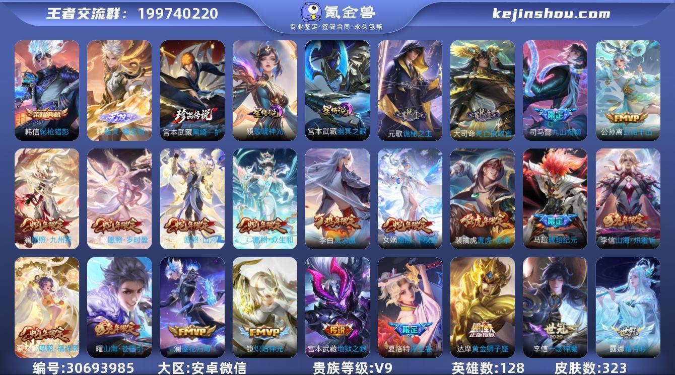 贵族等级:V9 典藏皮肤数:1 珍品无双皮肤数:0 无双皮肤数:1 珍品传说皮肤数:1 传说皮肤数:46 史诗皮肤数:93 皮肤数:323 英雄数:128 段位:星耀 卖家说:着急用钱退坑了不玩了,找个有缘人出了,价格好商量