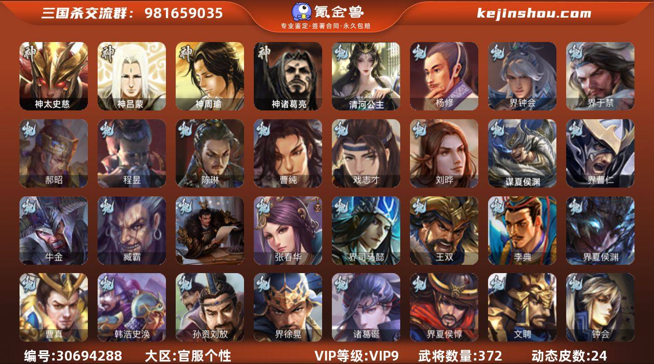 官阶:大将军;VIP等级:VIP9;史诗武将数量:39;动态皮肤数量:24;武将总数:372;史诗宝珠数量:0;将魂数量:5166;神将:2;魏国史诗武将:16;蜀国史诗武将:11;吴国史诗武将:6;群史诗武将:11 神太史慈,神诸葛亮,杨修,界钟会,界于禁,郝昭,陈琳,曹纯,戏志才,刘晔,清河公主,程昱,关索,马云騄,谋赵云,谋马超,诸葛瞻,赵襄,张星彩,王平,沙摩柯,界黄忠,鲍三娘,孙皓,孙寒华,骆统,留赞,界徐盛,贺齐,裴秀,左慈,张让,苏飞,祢衡,沮授,界左慈,界李儒,陈登,许攸,兀突骨,神吕蒙,神周瑜,SP关羽,SP蔡文姬,乐进,曹昂,诸葛诞,朱灵,文聘,SP姜维,张春华,钟会,曹冲,郭淮,满宠,界王异,界曹操,界司马懿,界夏侯惇,界张辽,界许褚,界郭嘉,李典,曹真,韩浩史涣,陈群,曹叡,曹休,钟繇,司马朗,王基,李通,郭皇后,孙资刘放,辛宪英,鲁芝,蒯越蒯良,界典韦,界荀彧,界徐晃,杜畿,界曹丕,毌丘俭,界邓艾,贾逵,界曹植,界曹彰,界满宠,界郭淮,卞夫人,辛毗,华歆,蔡贞姬,袁涣,王双,阮慧,谋徐晃,谋于禁,界曹休,谋夏侯渊,牛金,界夏侯渊,界曹仁,臧霸,SP孙尚香,关银屏,夏侯霸,马良,关兴张苞,廖化,界马岱,关平,简雍,刘封,界法正,界关兴张苞,界刘备,界关羽,界张飞,界赵云,界马超,SP徐庶,吴懿,周仓,张松,刘谌,夏侯氏,糜竺,孙乾,李严,黄皓,吴苋,秦宓,界黄月英,界诸葛亮,赵统赵广,严颜,界伊籍,界卧龙诸葛,界庞统,陈到,界姜维,界刘禅,张翼,杨仪,界廖化,邓芝,傅肜,界简雍,费祎,糜夫人,王甫赵累,界周仓,向宠,彭羕,谋庞统,谋姜维,谋张飞,霍峻,诸葛果,界魏延,蒋琬费祎,甘夫人,鲁肃,孙茹,凌操,大乔小乔,诸葛恪,诸葛瑾,孙鲁育,程普,韩当,潘璋马忠,虞翻,朱然,界周泰,界甘宁,界吕蒙,界黄盖,界周瑜,界大乔,界陆逊,孙鲁班,朱桓,顾雍,朱治,全琮,阚泽,孙登,岑昏,徐氏,薛综,界孙权,界孙尚香,潘濬,SP庞统,陆绩,孙亮,严畯,界孙坚,吕岱,周鲂,周妃,陆抗,界孙策,界张昭张纮,许贡,卫温诸葛直,界...