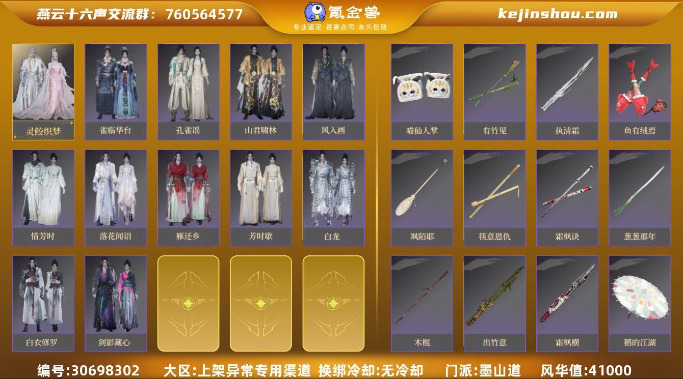 出自玩燕云号,t0陌刀,包里尘也快做完了武器成型了,有灵蛟大套,骑龙,笛子特效,马四个,小皮肤一大堆。1500万宝钱,自玩号望善待