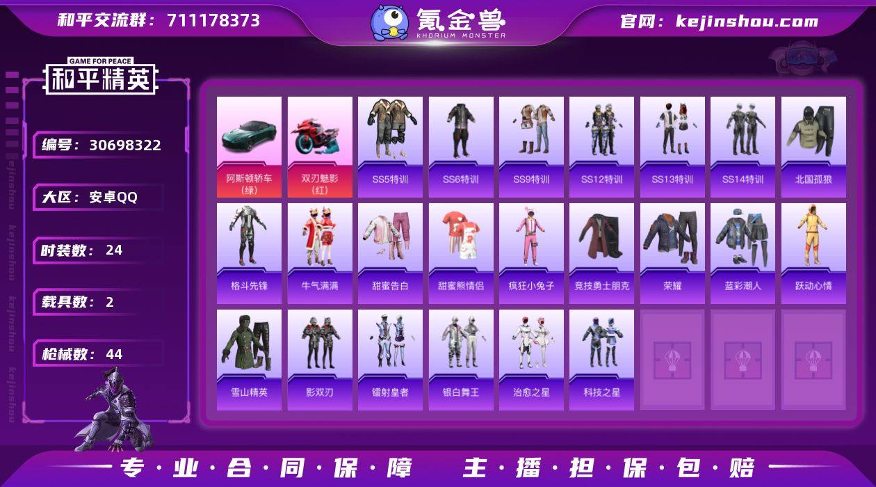 【AZH2359】安卓 手Q【2载具 阿斯顿马丁(绿) 双人摩托-双刃魅影(红)】0粉装-0特效枪-2载具-0粉色飞行器-13466热力值-2王牌印记-24套装-44枪皮 【粉色载具】:阿斯顿马丁DBS(绿),双人摩托-双刃魅影(红) 【稀有枪皮】:AKM-夜灯,AKM-霓虹街区,SCAR-L-红色方程式,M416-夜灯,M416-红色方程式,GROZA-治愈之星,M762-牛气冲天,M762-镭射皇者,UZI-红色方程式,UMP45-蓝色火焰,Vector-彩虹符号,Vector-治愈之星,汤姆逊-耀粉歌者,Kar98K-红色方程式,M24-治愈之星,M24-香水柠檬,VSS-镭射皇者,Mini14-金鼠迎春,Mk14-治愈之星,Mk14-童趣迷兔,SLR-四圣焕新,S686-奇异狩猎者,S686-红色方程式,S1897-镭射皇者,S12K-香水柠檬,S12K-夏日绵绵冰,S12K-幻影战神,M249-破晓战魂,M249-镭射皇者 【其他套装】:套装-SS5特训,套装-SS6特训,套装-SS9特训,套装-SS12特训,套装-SS13特训,套装-SS14特训,套装-北国孤狼,套装-格斗先锋,套装-牛气满满,套装-甜蜜告白,套装-甜蜜熊情侣,套装-疯狂小兔子,套装-竞技勇士朋克,套装-荣耀,套装-蓝彩潮人,套装-跃动心情,套装-雪山精英,套装-影双刃,套装-镭射皇者,套装-银白舞王,套装-治愈之星,套装-科技之星 【营地ID】:1019340134