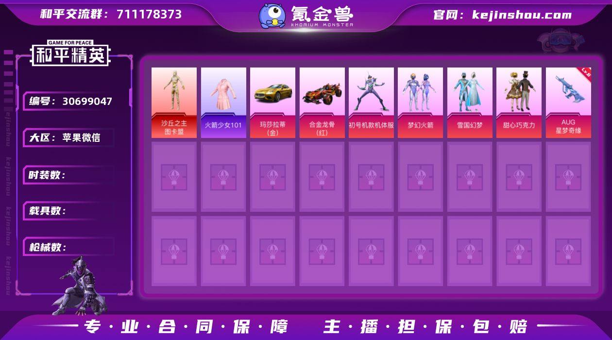 安卓手Q-15王牌印记-80粉装-27特效枪-17载具-热力值-391套装-448枪皮-3卓越印记-2传奇印记 【80粉装】,雪国幻梦,梦幻火箭,初号机款机体服,甜心巧克力,宝贝奶油派,天使彩虹糖,小叽联名款,缤纷油彩,放客神游,新星烈龙,童趣迷兔,蝶舞迷情,第五大道,洛天依,怪诞乔克,白勺歌姬,彩虹甜喵,恐龙拽拽,草莓生巧,花间之火,极致幻想,红伞翩翩,黄伞悠悠,黑伞漫漫,黄族统领,筑梦精灵,俏雪含霜,精灵迷巫,蓝莓炮弹,星之信仰,碧影闪光,甜蜜誓约,焦糖拿铁,流星咚咚,甜心娃娃,精灵娃娃,酣梦娃娃,诡面斩,绚金瑰梦,深海曼妙,潮汐统领,绚丽摇曳,橘柚倾心,海盐物语,冷魅冰骑,紫电风暴,迷蝶贵族,暖熊萌萌,寒光使者,甜梦小狐,馨动时刻,俏皮狐尾,冰川粉黛,冰川幽秘,冰川红玫,旋转彩虹,幻情紫藤,冰霜白皇,炙焰红王,彩虹鹿灵,独舞天鹅,山涧鹿灵,青葱仙萝,歌者泠鸢,暗夜鎏金,吟月归客,天之羽翼,苍蓝魅影,翡翠骑士,绚金战神,音爆索尼克,香水柠檬,挚爱序曲,碧蓝澄空,雪梅暗香,粉色回忆,烟云彩露,绝色倾城,齐天大圣,呆萌星弥 【27特效枪】AKM-甜心宝贝-7级 AKM-梦之光华-2级 SCAR-L-纯梦嫁纱-1级 SCAR-L-梦幻火箭-2级 SCAR-L-童趣迷兔-6级 M416-心之恋语-4级 M416-五爪金龙-6级 GROZA-香水柠檬-6级 GROZA-旋转彩虹-1级 AUG-超新星-5级 M762-甜蜜誓约-1级 M762-甜心娃娃-4级 Kar98K-绿意幻情-2级 Kar98K-巳巳如意-5级 M24-镜域双华-2级 AWM-橘柚倾心-4级 SKS-碧影闪光-2级 Mini14-绚金瑰梦-4级 Mk14-闲梦青缨-3级 UZI-筑梦精灵-2级 UMP45-恐龙拽拽-4级 野牛-流星咚咚-2级 S12K-海渊国主-4级 SPAS-12-蜜语绒猫-2级 M249-蓝莓炮弹-4级 MG3-梦幻舞会-3级 平底锅-林间仙鹿-6级 【19稀有紫装】,冥河战士,都市猎人,赤蝎幽灵,2B战斗服款,萌熊伴侣背包(3级),暗影哥特,深海小丑鱼,沙漠守