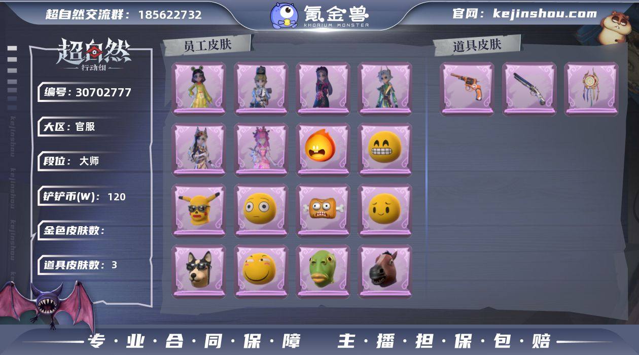 066紫色皮肤数量: 6 道具皮肤数量: 3 段位: 大师 员工: 逍遥,薇薇安,巫铃儿,莉莉,阿念,艾伦,小黄,零,爱丽丝,兰 外观: 王子与骑士,丝缕哀歌,泽引山海,白光莹,情公主,嘻嘻头套,烈焰红唇头套,呆滞头套,炙热烧烤,卑微头套,哈士奇头套,滑稽头套,鱼头怪头套,面具马头套,萨卡班甲鱼头套,咬咬鲨头套,呱呱雨衣,火爆了头套