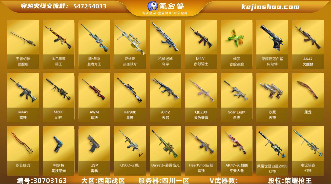 YXB 特价秒杀【四川一区】【不可二次实名】【可排位】【荣耀枪王】【会员等级VIP4】【CF点1222】【V武器数43】【幻神2皮】【竞技荣光套装X4套】【M200-幻神】【幻神-荣耀世冠白鲨2023 皮肤】【幻神-电流骇客 皮肤】【王者幻神-觉醒版】【Kar98K-星神】【Kar98K-星神音效卡】【AWM-裁决】【裁决-流光秘银】【Scar Light-白虎】【QBZ03-金色蔷薇】【金色蔷薇-破浪逐光 皮肤】【G36C-幻影】【柯尔特-荣耀世冠白鲨2023】【USP-雷暴】【柯尔特-竞技荣光】【炽芒蝶刃】【炽芒蝶刃-荣耀世冠白鲨2023 皮肤】【电竞教官-云悠悠】【关小雨】【乔伊教练】【晴雅】【蛇隐宗】【云海玲珑】【M4A1-雷神】【雷神-HeartShot 皮肤】【雷神-化蛇 皮肤】【AK47-火麒麟】【火麒麟-平天大圣】【火麒麟-CFSTAR】