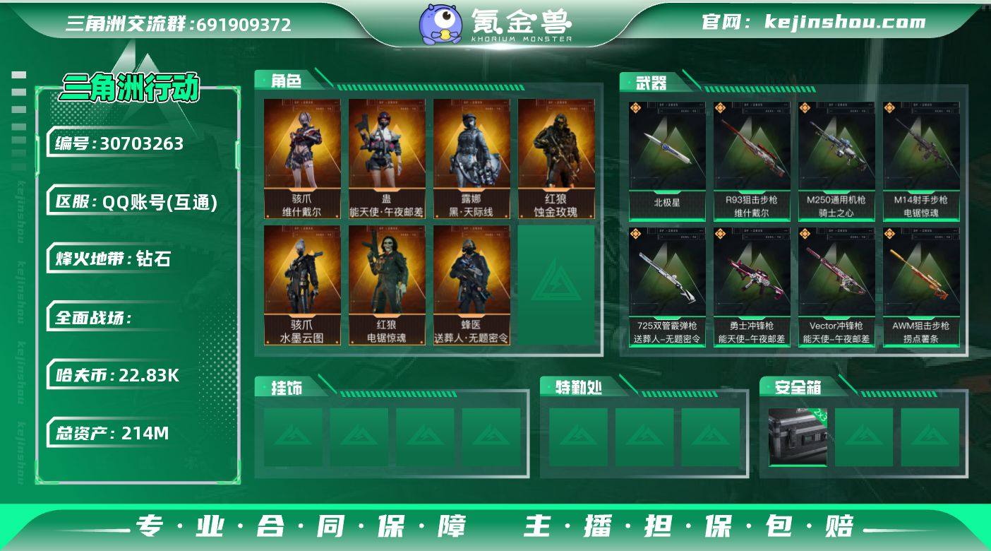"YXB-22833k哈伏币-总资产214m流动资产162m-60烽火等级-钻石-12战场等级-列兵 部门33323特勤处仓库9训练中心6靶场6 【干员外观】:红狼-蚀金玫瑰,骇爪-水墨云图,露娜-黑·天际线,蛊-能天使午夜邮差,骇爪-维什戴尔,蜂医-送葬人·无题密令,红狼-电锯惊魂 【近战皮肤】:近战-北极星,近战-电锯惊魂,近战-黑鹰 【典藏外观】:K416突击步枪-命运极品A,AUG突击步枪-气象感应优品C电,腾龙突击步枪-气象感应优品S毒,M7战斗步枪-棱镜攻势S2优品S, 【传说级普通外观】:M4A1突击步枪-蚀金玫瑰,M4A1突击步枪-阿米娅,ASh-12战斗步枪-鹅鸭杀,AK-12突击步枪-特斯拉线圈,SCAR-H战斗步枪-水墨云图,SCAR-H战斗步枪-启航,CAR-15突击步枪-阿米娅,腾龙突击步枪-捞点薯条,K437突击步枪-北极星,Vector冲锋枪-能天使-午夜邮差,UZI冲锋枪-特斯拉线圈,SR-3M紧凑突击步枪-特斯拉线圈,勇士冲锋枪-能天使-午夜邮差,QCQ171冲锋枪-北极星,QCQ171冲锋枪-鹅鸭杀,S12K霰弹枪-电锯惊魂,725双管霰弹枪-送葬人-无题密令,M250通用机枪-骑士之心,QJB201轻机枪-鹅鸭杀,M14射手步枪-电锯惊魂,R93狙击步枪-维什戴尔,AWM狙击步枪-捞点薯条,93R-捞点薯条,复合弓-黑·天际线 "