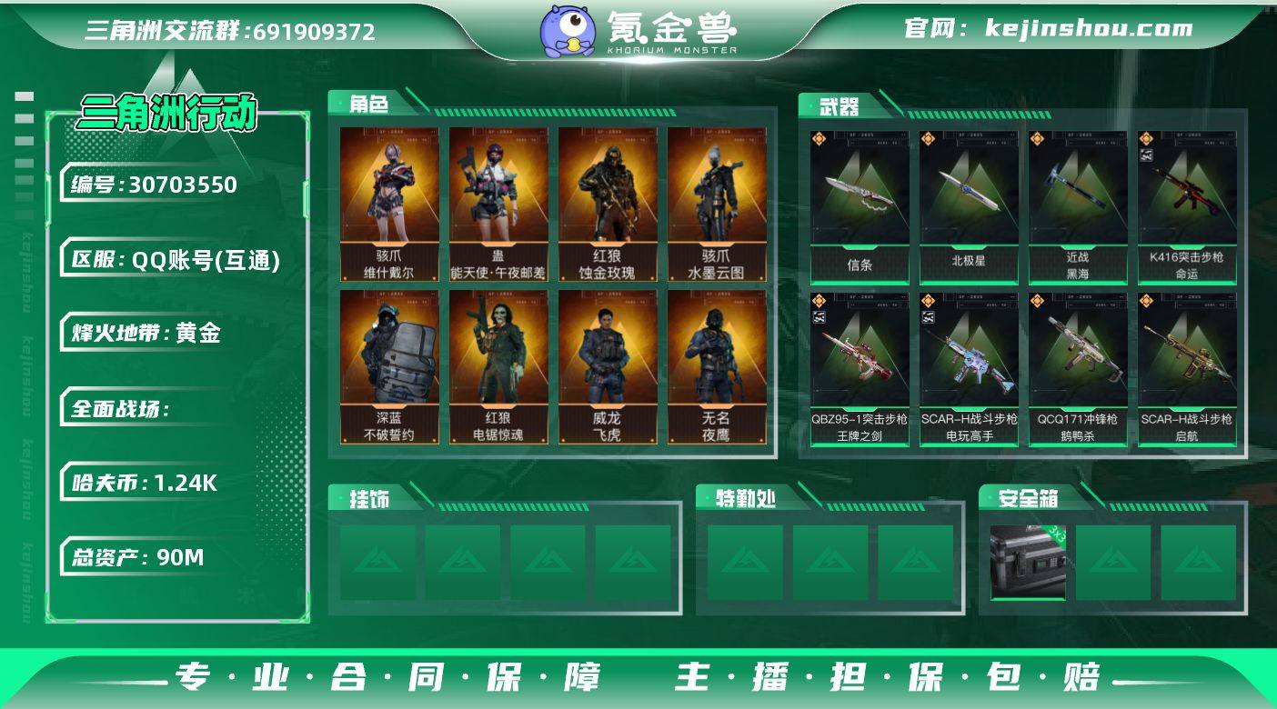 "YXB-【4551三角币-1245k哈伏币-90m总资产-52m流动资产-60烽火等级-黄金】 【特勤处】仓库8-训中满级-靶场满级 部门:44444 【干员外观】:红狼-蚀金玫瑰,骇爪-水墨云图,蛊-能天使午夜邮差,骇爪-维什戴尔,威龙-飞虎,无名-夜鹰,深蓝-不破誓约,红狼-电锯惊魂 【近战皮肤】:近战-黑海,近战-北极星,近战信条 【典藏外观】:SCAR-H战斗步枪-电玩高手-极品S,QBZ95-1突击步枪-王牌之剑-优品C,K416突击步枪-命运-极品S 【其他】s7赛季通行证 【传说级普通外观】:M4A1突击步枪-蚀金玫瑰,M4A1突击步枪-阿米娅,ASh-12战斗步枪-鹅鸭杀,AK-12突击步枪-夜鹰,SCAR-H战斗步枪-水墨云图,SCAR-H战斗步枪-启航,CAR-15突击步枪-黑鹰坠落,CAR-15突击步枪-阿米娅,K437突击步枪-北极星,MP5冲锋枪-黑海,Vector冲锋枪-能天使-午夜邮差,勇士冲锋枪-能天使-午夜邮差,QCQ171冲锋枪-北极星,QCQ171冲锋枪-鹅鸭杀,M250通用机枪-骑士之心,QJB201轻机枪-黑海,QJB201轻机枪-鹅鸭杀,R93狙击步枪-维什戴尔,G18-飞虎"