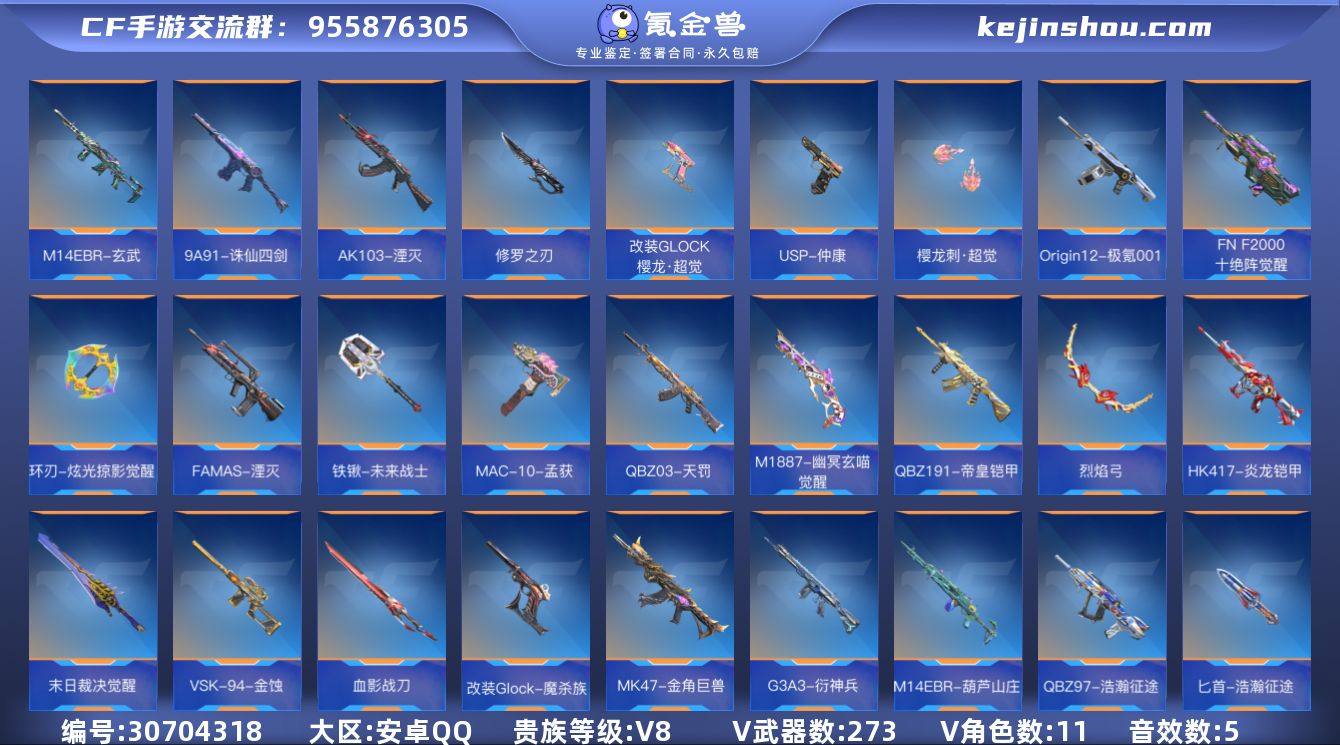 贵族等级:V8 王者武器数:16 v武器数:273 卖家说:奉先无双套➕星象套➕孟德过载套➕仁德赢魔套➕权➕黑龙魂➕m4雷霆王者➕冰皮➕王者白虎➕冰皮➕雷霆cop➕凤雏➕m4游骑兵➕紫魔皮➕大量生化顶级武器➕大量三国武器,➕无畏契约充了四千多的连体账号