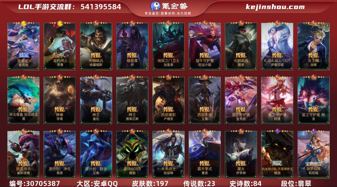 皮肤数:197 典藏皮肤数量:0 神话皮肤数量:2 传说皮肤数量:23 史诗皮肤数量:84 夜星流火 金克丝,龙的传人 段位:翡翠