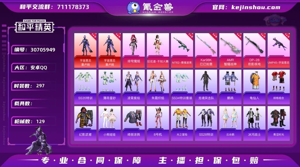 1红装 2粉装 5特效枪 3印记 可二次 可修改实名 【三级神装】:三级宇宙意志-塞卢姆(3级塞卢姆) 【热门装扮】:狂花道·不知火舞,绯穹魔姬 【稀有枪皮】:AMR-智耀战神,Kar98K-巳巳如意,UMP45-宇宙意志,M762-青锋波束,DP-28-豹影疾电 【五级特效枪】:五级M762-青锋波束,五级Kar98K-巳巳如意 【三级特效枪】:三级UMP45-宇宙意志,三级DP-28-豹影疾电,三级AMR-智耀战神