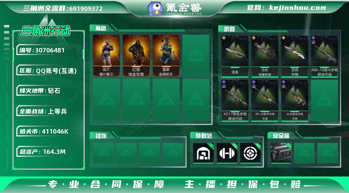 实名:可二次实名 总资产:164.3M 哈夫币:411046K S7顶级安全箱(3x3) 烽火地带段位:钻石 烽火地带等级:60 全面战场段位:上等兵 全面战场等级:31 8级仓库,满级训练中心,满级靶场,满级指挥中心,满级潜水中心,满级防具台 战术部门等级:3 战斗部门等级:3 医疗部门等级:3 研发部门等级:3 后勤部门等级:3 曼德尔砖-气象感应:1 曼德尔砖-命运王牌:1 曼德尔砖-棱镜攻势S2:1
