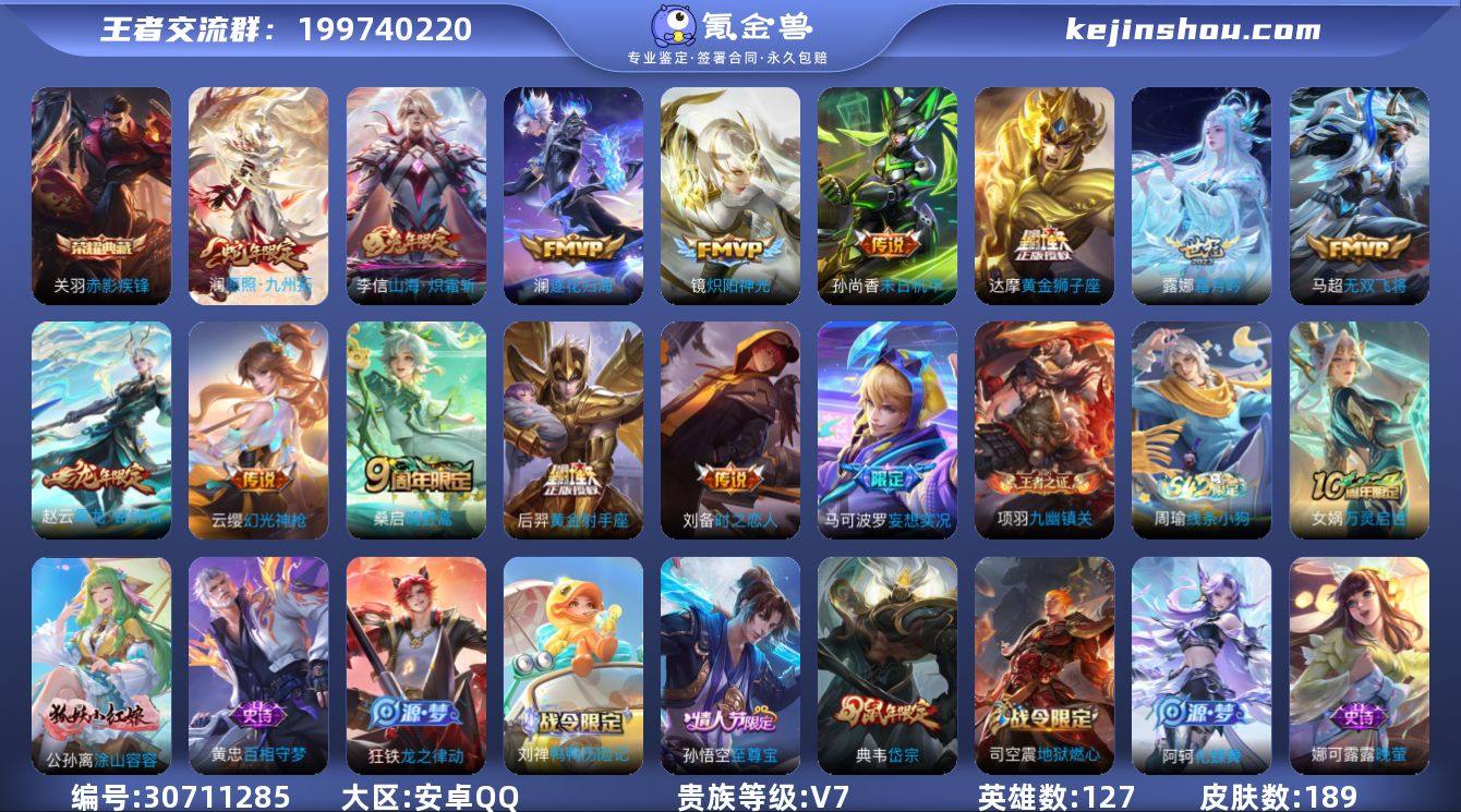 无二次-安卓Q-V7-至尊星耀IV段位-127英雄-189皮肤-1典藏皮肤-14传说-49史诗HZ261204 【英雄全皮】:孙权全皮 【荣耀典藏】:关羽赤影疾锋 【传说皮肤】:澜愿照九州拓,云缨幻光神枪,桑启鸣野蒿,赵云乘龙铭钟鼎,澜逐花归海,露娜霜月吟,马可波罗妄想实况,李信山海炽霜斩,马超无双飞将,镜炽阳神光,刘备时之恋人,达摩黄金狮子座,后羿黄金射手座,孙尚香末日机甲 【限定皮肤】:姜子牙天穹之誓,狄仁杰阴阳师,赵云皇家上将,庄周高山流水,吕布猎兽之王,典韦岱宗,马可波罗妄想实况,狄仁杰魔术师,达摩沙漠行僧,项羽海滩派对,程咬金演武夺筹,孙悟空至尊宝,李元芳匿光侦查者,钟馗驱傩正仪,干将莫邪胡桃夹子,鬼谷子原初探秘者,百里玄策原初追逐者,梦奇顽趣,沈梦溪大漠名商,裴擒虎擒涛扼浪,云中君纤云弄巧,李信山海炽霜斩,嫦娥拒霜思,鲁班大师探海日志,桑启海盐诗旅,艾琳流音漫舞,司空震地狱燃心,阿古朵江河有灵,张良古海寻踪,蒙犽百解令,蒙恬荣光圣徽,高渐离燃音魔法,妲己灵卜魔法,鬼谷子天穹祈灯,伽罗琥珀纪元,赵云乘龙铭钟鼎,百里玄策超元猎域,沈梦溪龙舞盛年,刘邦剑破天穹 【年限皮肤】:典韦岱宗,李信山海炽霜斩,赵云乘龙铭钟鼎,澜愿照九州拓 【赛季限定】:鬼谷子原初探秘者,程咬金演武夺筹,钟馗驱傩正仪,达摩沙漠行僧,沈梦溪大漠名商,桑启海盐诗旅,裴擒虎擒涛扼浪,鲁班大师探海日志,张良古海寻踪,鬼谷子天穹祈灯,刘邦剑破天穹,姜子牙天穹之誓,东皇太一噬灭天穹,太乙真人谧流熔炉,钟馗虚灵犬护,甄姬逆浪荇歌,亚瑟荣光之誓,百里玄策原初追逐者,梦奇顽趣,蒙恬荣光圣徽,牛魔星界战将,项羽九幽镇关 【战令限定】:吕布猎兽之王,司空震地狱燃心,艾琳流音漫舞,高渐离燃音魔法,妲己灵卜魔法,孙膑茶境仙,马超访茗客,刘禅鸭鸭历险记,沈梦溪鸭...