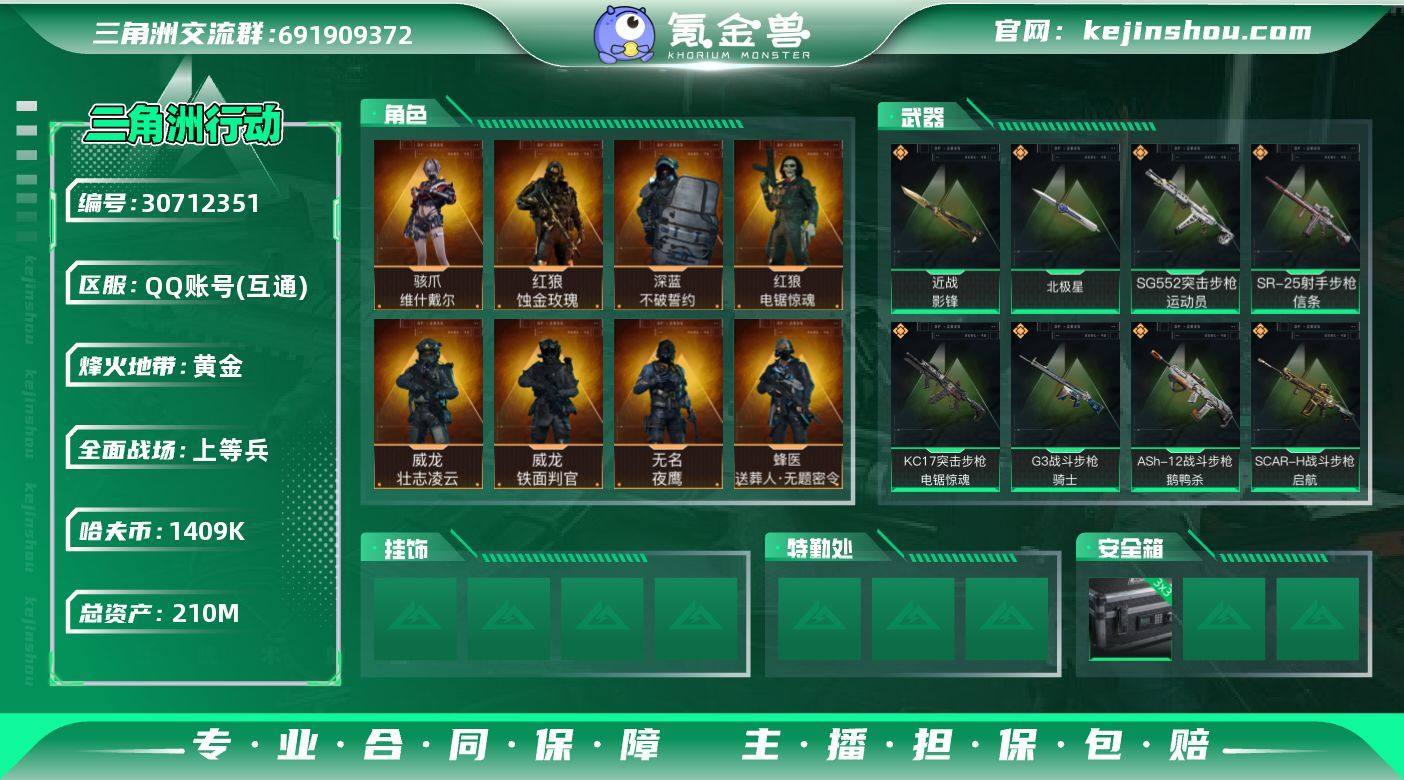 210m总资产-1409k哈伏币-60烽火等级-黄金-36战场等级-上等兵 【干员外观】:红狼-蚀金玫瑰,骇爪-维什戴尔,威龙-铁面判官,威龙-壮志凌云,蜂医-送葬人·无题密令,无名-夜鹰,深蓝-不破誓约,红狼-电锯惊魂 【近战皮肤】:近战-影锋,近战-北极星,近战-黑鹰 【传说外观】:M4A1突击步枪-蚀金玫瑰,M4A1突击步枪-阿米娅,QBZ95-1突击步枪-破军,ASh-12战斗步枪-鹅鸭杀,SG552突击步枪-运动员,AK-12突击步枪-夜鹰,AK-12突击步枪-特斯拉线圈,SCAR-H战斗步枪-铁艺苍穹,SCAR-H战斗步枪-启航,G3战斗步枪-骑士,CAR-15突击步枪-阿米娅,腾龙突击步枪-捞点薯条,KC17突击步枪-电锯惊魂,UZI冲锋枪-特斯拉线圈,SMG-45冲锋枪-骑士,SR-3M紧凑突击步枪-特斯拉线圈,勇士冲锋枪-能天使-午夜邮差,QCQ171冲锋枪-北极星,QCQ171冲锋枪-鹅鸭杀,725双管霰弹枪-送葬人-无题密令,M250通用机枪-骑士之心,QJB201轻机枪-鹅鸭杀,SR-25射手步枪-水墨云图,SR-25射手步枪-信条,SV-98狙击步枪-极速狂飙,R93狙击步枪-维什戴尔,AWM狙击步枪-捞点薯条,93R-捞点薯条,复合弓-黑·天际线 【史诗外观】:AUG突击步枪-天命,M4A1突击步枪-特勤执行,AKM突击步枪-林中猎手,QBZ95-1突击步枪-曙光,QBZ95-1突击步枪-ACE,ASh-12战斗步枪-守夜人,ASh-12战斗步枪-无极限,M16A4突击步枪-竞赛选手,AUG突击步枪-蝮蛇,AUG突击步枪-特勤执行,SG552突击步枪-尖端治疗,SG552突击步枪-深海恐惧,SCAR-H战斗步枪-国风,SCAR-H战斗步枪-囚徒,G3战斗步枪-阿萨拉工艺,G3战斗步枪-战场英杰,G3战斗步枪-流沙送葬,PTR-32突击步枪-ACE,AS Val突击步枪-尖端治疗,AS Val突击步枪-典狱官,AS Val突击步枪-百步穿杨,腾龙突击步枪-无垢,腾龙突击步枪-猎鳄行动,K437突击步枪-守护者,MP5冲锋枪-深海恐惧,MP5冲锋枪-战术竞备,P90冲锋枪-莫斯提...