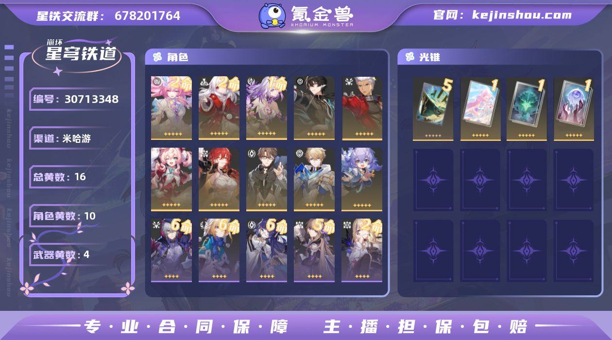 开拓等级:67 开拓者性别:女 总黄数:16 星轨专票:15 五星角色数:10 2命昔涟,2命克拉拉,1命遐蝶,0命丹恒·腾荒,0命Archer,0命风堇,0命姬子,0命瓦尔特,0命杰帕德,0命白露 五星光锥数:4 5精星海巡航,1精爱如此刻永恒,1精不息的演算,1精记忆永不落幕 邮箱状态:不送邮 卖家说:看截图