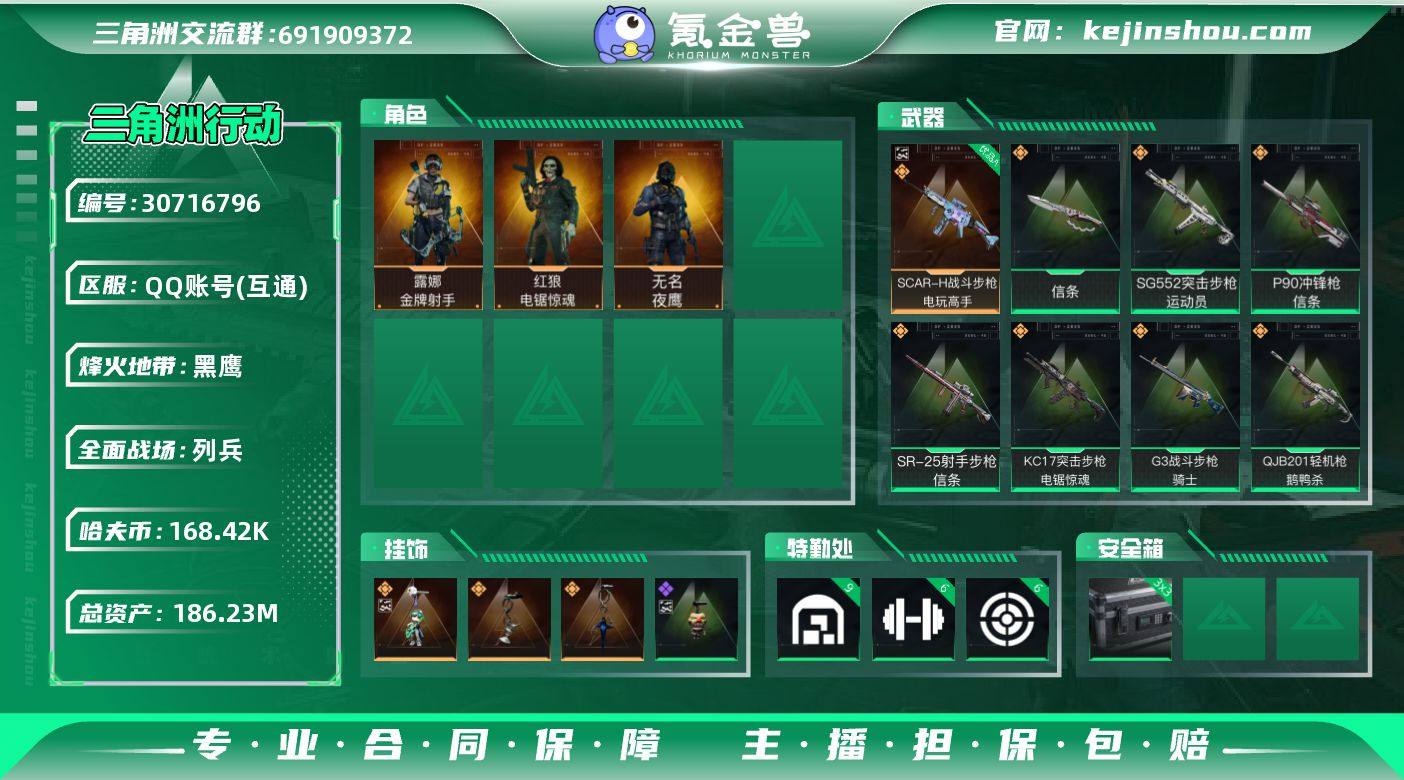 实名:不可二次实名 总资产:186.23M 哈夫币:168.42K S7顶级安全箱(3x3) 烽火地带段位:黑鹰 烽火地带等级:60 全面战场段位:列兵 全面战场等级:23 9级仓库,6级训练中心,6级靶场,2级潜水中心,1级收藏室