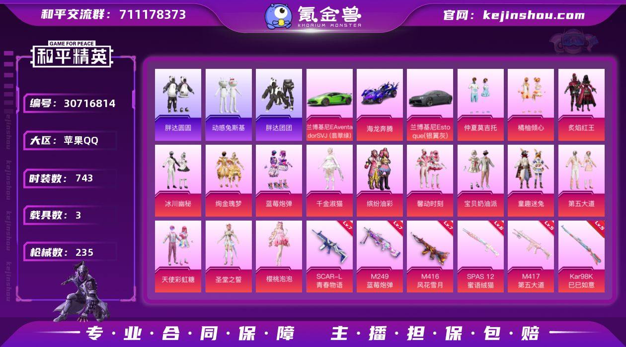 号上有1600+点券,可以买豪华手册,紫装有浪漫天命、两套胖达、狂沙舞者、兔兔白日梦、激萌罗小黑、兔斯基、激萌小黄鸭