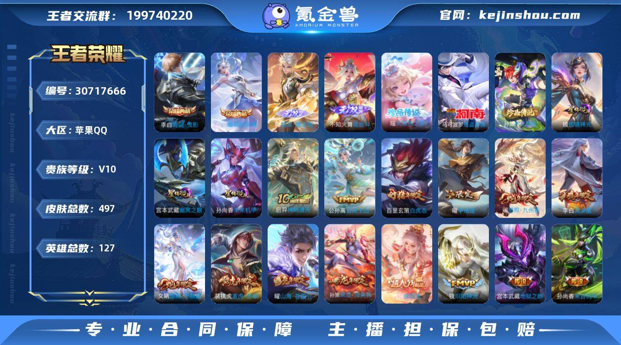 贵族等级:V10 典藏皮肤数:2 珍品无双皮肤数:0 无双皮肤数:2 珍品传说皮肤数:3 传说皮肤数:52 史诗皮肤数:171 皮肤数:497 英雄数:127 段位:星耀