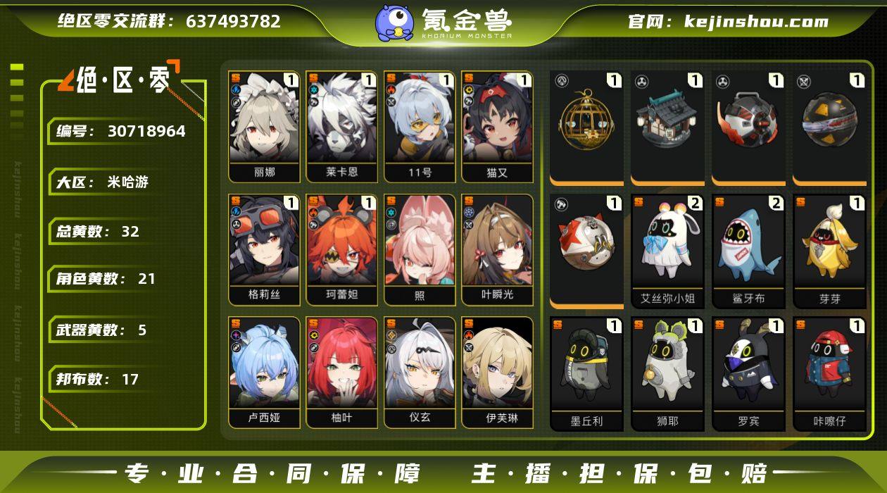 冒险等级:58 总黄数:32 菲林底片数量:240 菲林数量:92 加密母带数量:12 五星角色数:21 1命丽娜,1命莱卡恩,1命「11号」,1命猫又,1命格莉丝,1命珂蕾妲,0命叶瞬光,0命照,0命卢西娅,0命柚叶,0命仪玄,0命伊芙琳,0命耀嘉音,0命浅羽悠真,0命星见雅,0命月城柳,0命柏妮思·怀特,0命凯撒,0命简,0命青衣,0命朱鸢 五星武器数:5 1精青溟笼舍,1精霰落星殿,1精嵌合编译器,1精硫磺石,1精燃狱齿轮 邦布数量:17 2精艾丝弥小姐,2精鲨牙布,1精芽芽,1精墨丘利,1精狮耶,1精罗宾,1精咔嚓仔,1精格列佛探员,1精赤红莫库斯,1精阿崔巡查,1精巴特勒,1精飚速布,1精艾米莉安,1精阿全,1精插头布,1精左轮布,1精共鸣布 狡黠甜心,晴澜双迹套装,漪光夜曲 卖家说:可协商