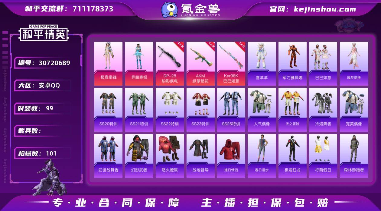 安卓 【小号 军刀雅典娜/异瞳寒姬/AKM-绿萝繁花(五级)】手Q-2粉装-3特效枪-0载具-1粉色飞行器-26481热力值-7王牌印记-99套装-101枪皮 【热门品类】:角色-军刀雅典娜 【粉色套装】:角色-异瞳寒姬,粉装-极意拳锋 【粉色枪皮等级】:AKM-绿萝繁花(五级),Kar98K-巳巳如意(五级),DP-28-豹影疾电(五级) 【粉色枪皮】:AKM-绿萝繁花,Kar98K-巳巳如意,DP-28-豹影疾电 【粉色降落伞】:旋转彩虹降落伞,纯梦嫁纱降落伞,星穹咏叹调降落伞,异瞳寒姬降落伞,炫彩糖果降落伞,罪夜之冕降落伞 【稀有套装】:套装-巳巳如意,角色-瑰梦爱神,玩偶服-喜羊羊,套装-炫彩糖果 【稀有枪皮】:AKM-破晓战魂,M16A4-幻世战舞者,SCAR-L-夜灯,SCAR-L-炫彩节奏,SCAR-L-玉兔迎春,M416-糯团青竹,M416-蓝色火焰,GROZA-田园牧歌,AUG-耀粉歌者,QBZ-彩虹符号,M762-天降萌叽,M762-彩虹符号,M762-登顶巅峰,Mk47-妙红点点,Mk47-洛神天依,AC-VAL-天降萌叽,蜜獾-天降萌叽,蜜獾-娇憨猪猪,蜜獾-绯穹魔姬,UZI-天降萌叽,UZI-娇憨猪猪,UZI-影袭,UMP45-夜灯,UMP45-生命誓言,UMP45-蓝色火焰,Vector-生命誓言,Vector-田园牧歌,Vector-音爆索尼克,汤姆逊-天降萌叽,汤姆逊-幻影战神,汤姆逊-耀粉歌者,AKS-74U-鬼刀,P90-巳巳如意,Kar98K-魅影蝠王,Kar98K-星穹咏叹调,SKS-炫彩节奏,VSS-田园牧歌,Mini14-炫彩节奏,Mini14-耀粉歌者,SLR-娇憨猪猪,SLR-彩虹符号,AMR-妙红点点,S686-巳巳如意,S1897-炫彩节奏,S12K-夜灯,S12K-娇憨猪猪,S12K-幻世战舞者,SPAS-12-田园牧歌,M249-妙红点点,M249-彩虹符号,MG3-妙红点点,MG3-幻世战舞者,沙漠之鹰-旋转彩虹,大砍刀-鬼刀,破片手榴弹-巳巳如意 【其他套装】:套装-SS20特训,套装-SS21特训,套装-SS22特训,套装-SS23特训,套装-SS25特训,套装-人气偶像,套装-光...