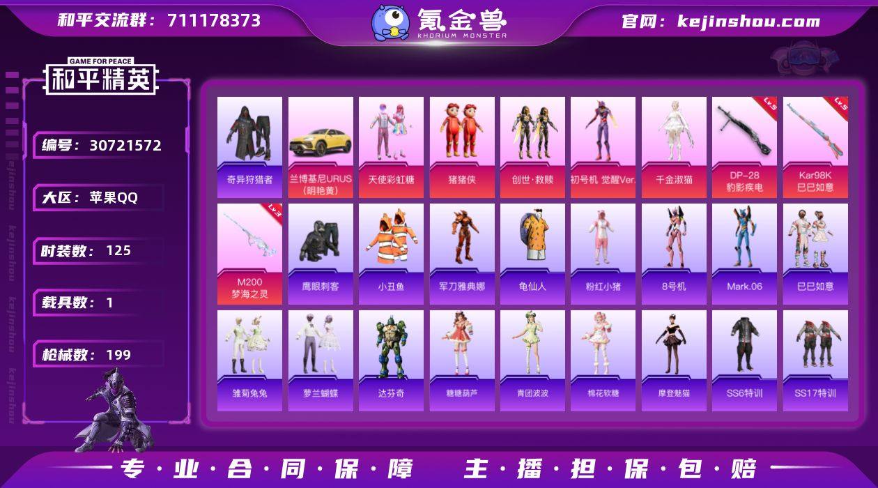 苹果 【公主号 小丑鱼/奇异狩猎者/龟仙人/Mark.06/天使彩虹糖/千金淑猫/Kar98K-巳巳如意(五级)/兰博基尼URUS(明艳黄)】手Q-5粉装-3特效枪-1载具-3粉色飞行器-57655热力值-5王牌印记-125套装-199枪皮 【热门品类】:套装-小丑鱼,套装-奇异狩猎者,角色-军刀雅典娜,套装-龟仙人,套装-粉红小猪,角色-8号机,角色-Mark.06 【粉色套装】:粉装-天使彩虹糖,玩偶服-猪猪侠,套装-创世·救赎,角色-初号机 觉醒Ver.,角色-千金淑猫 【粉色枪皮等级】:Kar98K-巳巳如意(五级),M200-梦海之灵(三级),DP-28-豹影疾电(五级) 【粉色载具】:兰博基尼URUS(明艳黄) 【粉色枪皮】:Kar98K-巳巳如意,M200-梦海之灵,DP-28-豹影疾电 【粉色飞行器】:星夜魔法师飞行翼,沙丘之主天马,深渊漩涡飞行器 【粉色降落伞】:神秘黑猫降落伞,蓝莓炮弹降落伞,冰川粉黛降落伞,音爆索尼克降落伞,莲影清波降落伞,镜光幻境降落伞,沙丘之主降落伞,猪猪侠降落伞,精灵梦叶罗丽降落伞,守护天翼降落伞,初号机 觉醒Ver.降落伞,忍者神龟降落伞,千金淑猫降落伞 【稀有套装】:套装-龟仙人,套装-巳巳如意,套装-雏菊兔兔,套装-萝兰蝴蝶,角色-达芬奇,套装-糖糖葫芦,套装-青团波波,套装-棉花软糖,角色-摩登魅猫 【稀有枪皮】:AKM-彩虹符号,AKM-影袭,AKM-灼热熔岩,AKM-王牌投手,AKM-环太平洋,AKM-破晓战魂,AKM-筑梦精灵,AKM-缤纷海域,AKM-虎虎生威,AKM-霓虹街区,AKM-龙的传人,M16A4-幻世战舞者,M16A4-甜心亚梦,M16A4-生命誓言,M16A4-千金淑猫,SCAR-L-是爱神辣,SCAR-L-炫彩节奏,SCAR-L-玉兔迎春,SCAR-L-红色方程式,SCAR-L-黄金龙骨,M416-仓鼠灰灰,M416-暗夜行者,M416-糯团青竹,M416-红色方程式,M416-蓝色火焰,M416-黄金狮王,GROZA-异彩先驱,GROZA-影袭,GROZA-田园牧歌,GROZA-蓝莓炮弹,AUG-耀粉歌...