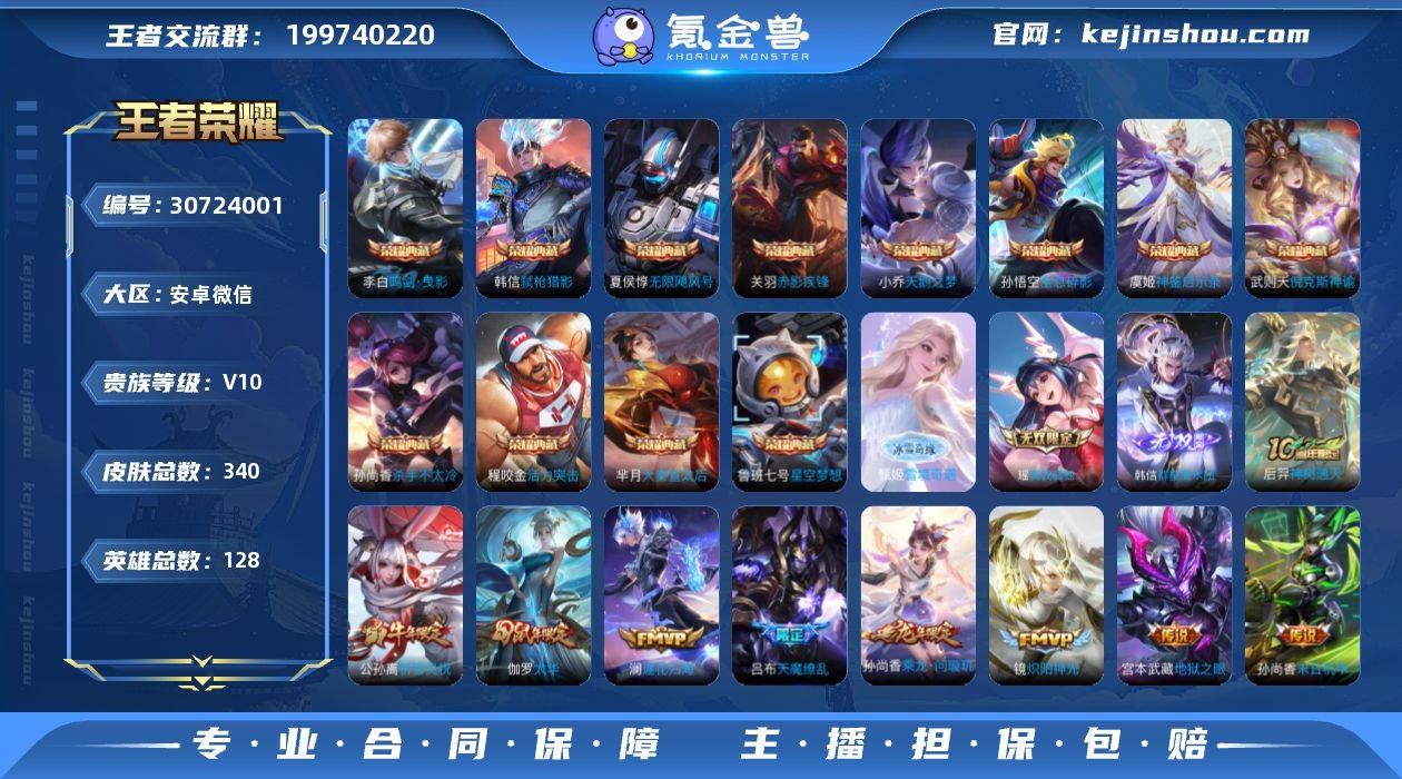 贵族等级:V10 典藏皮肤数:12 珍品无双皮肤数:0 无双皮肤数:3 珍品传说皮肤数:0 传说皮肤数:50 史诗皮肤数:99 皮肤数:340 英雄数:128 段位:钻石 卖家说:王者荣耀 金铲铲都是v10+