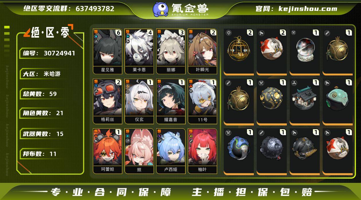冒险等级:60 总黄数:59 菲林底片数量:0 菲林数量:362 加密母带数量:0 五星角色数:21 6命星见雅,4命莱卡恩,3命丽娜,2命叶瞬光,2命格莉丝,1命仪玄,1命耀嘉音,1命「11号」,1命珂蕾妲,0命照,0命卢西娅,0命柚叶,0命橘福福,0命伊芙琳,0命浅羽悠真,0命莱特,0命柏妮思·怀特,0命青衣,0命朱鸢,0命艾莲,0命猫又 五星武器数:15 2精青溟笼舍,2精燃狱齿轮,1精云霓孤光,1精铸梦炉歌,1精心弦夜响,1精霰落星殿,1精玉壶青冰,1精防暴者VI型,1精啜泣摇篮,1精拘缚者,1精钢铁肉垫,1精深海访客 邦布数量:11 5精芽芽,5精咔嚓仔,3精鲨牙布,2精狮耶,1精比克布利克,1精艾丝弥小姐,1精罗宾,1精格列佛探员,1精赤红莫库斯,1精巴特勒,1精共鸣布 狡黠甜心,墨形影踪,漪光夜曲 卖家说:原神崩铁连体号,防卫战危局无痛过