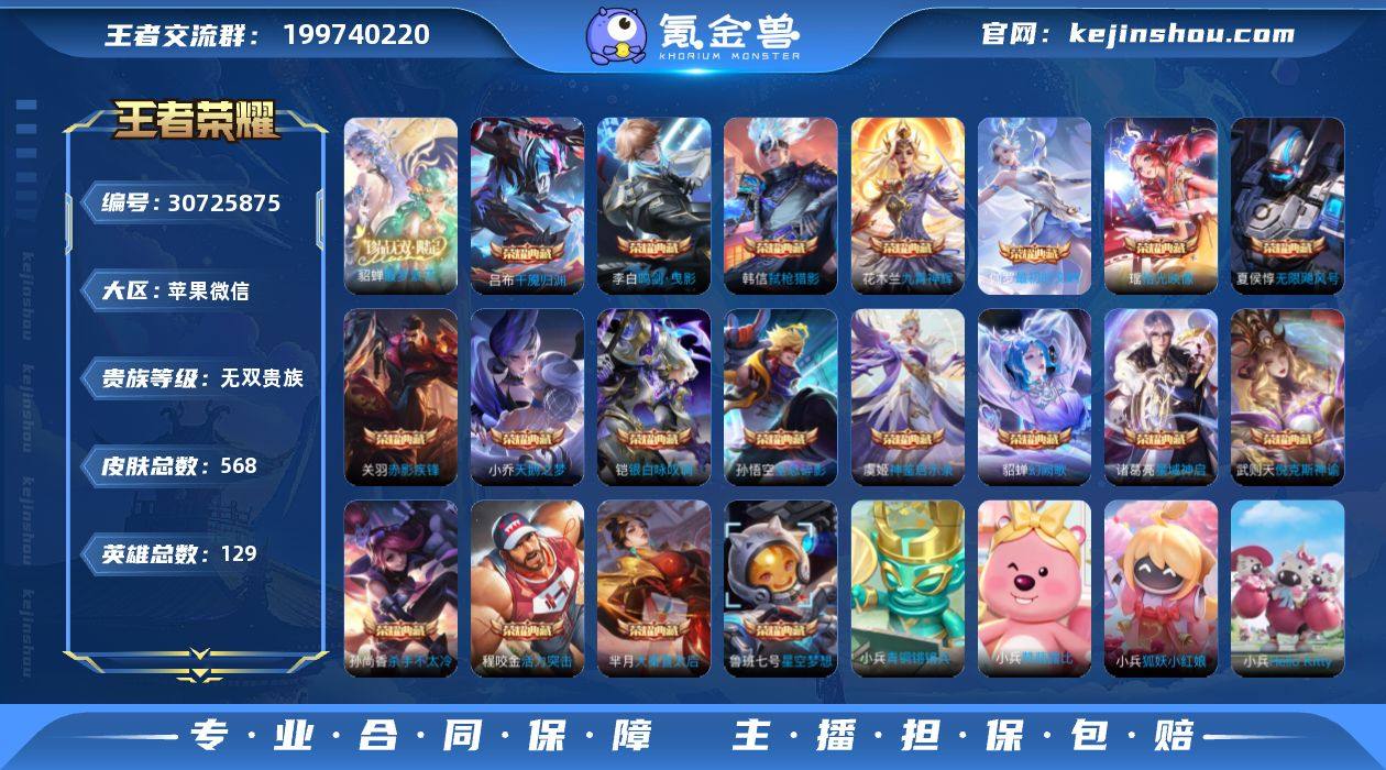 贵族等级:无双贵族 典藏皮肤数:19 珍品无双皮肤数:1 无双皮肤数:13 珍品传说皮肤数:8 传说皮肤数:78 史诗皮肤数:182 皮肤数:568 英雄数:129 段位:星耀 卖家说:差个张飞珍品,满典藏满无双