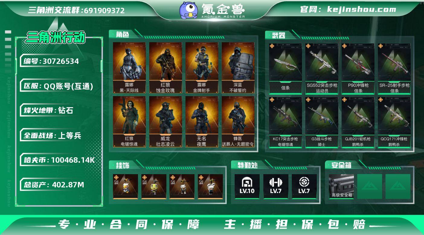 实名:不可二次实名 总资产:402.87M 哈夫币:100468.14K S7高级安全箱(2x3) 烽火地带段位:钻石 烽火地带等级:60 全面战场段位:上等兵 全面战场等级:16 10级仓库,7级训练中心,7级靶场,2级潜水中心,1级收藏室