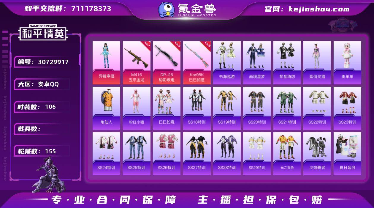 不能二次 和平王者一体号 安卓 手Q-1粉装-4特效枪-0载具-1粉色飞行器-45346热力值-8王牌印记-106套装-155枪皮 QW2612115 【热门品类】:套装-龟仙人,套装-粉红小猪 【粉色套装】:角色-异瞳寒姬 【粉色枪皮等级】:M416-五爪金龙(七级),AKS-74U-森灵之息(四级),Kar98K-巳巳如意(五级),DP-28-豹影疾电(五级) 【粉色枪皮】:M416-五爪金龙,AKS-74U-森灵之息,Kar98K-巳巳如意,DP-28-豹影疾电 【粉色降落伞】:绝对恒星降落伞,梦幻火箭降落伞,蓝莓炮弹降落伞,碧影闪光降落伞,恐龙拽拽降落伞,垂柳戏鸭降落伞,天星战神降落伞,无垠阁降落伞,异瞳寒姬降落伞,极意拳锋降落伞,炫彩糖果降落伞 【稀有套装】:套装-龟仙人,套装-巳巳如意,套装-雪国风尚,套装-炫彩糖果,玩偶服-美羊羊,角色-紫俏灵猫,套装-书海巡游,套装-画境星梦,套装-琴音绮想 【稀有枪皮】:AUG-冰晶雪宝,AKM-冰凉西瓜,AKM-夜灯,AKM-彩虹符号,AKM-影袭,AKM-灼热熔岩,AKM-破晓战魂,AKM-霓虹街区,AKM-龙的传人,M16A4-幻世战舞者,M16A4-甜心亚梦,M16A4-蓝色火焰,SCAR-L-炫彩节奏,SCAR-L-玉兔迎春,SCAR-L-红色方程式,SCAR-L-黄金龙骨,M416-糯团青竹,M416-红色方程式,M416-蓝色火焰,GROZA-异彩先驱,GROZA-影袭,GROZA-懵萌河马,AUG-天降萌叽,AUG-耀粉歌者,QBZ-彩虹符号,QBZ-飞驰魅影,M762-天降萌叽,M762-诡娃娃,M762-登顶巅峰,Mk47-妙红点点,G36C-懵萌河马,AC-VAL-天降萌叽,AC-VAL-甜心亚梦,蜜獾-天降萌叽,蜜獾-娇憨猪猪,蜜獾-绯穹魔姬,ACE32-画境星梦,UZI-啾咪啾咪,UZI-天降萌叽,UZI-娇憨猪猪,UZI-影袭,UZI-红色方程式,UMP45-生命誓言,UMP45-蓝色火焰,Vector-彩虹符号,汤姆逊-天降萌叽,汤姆逊-异彩先驱,野牛-天星战神,MP5K-异彩先驱,MP5K-画境星梦,P90-飞驰魅影,Kar98K-炫彩节奏,Kar...