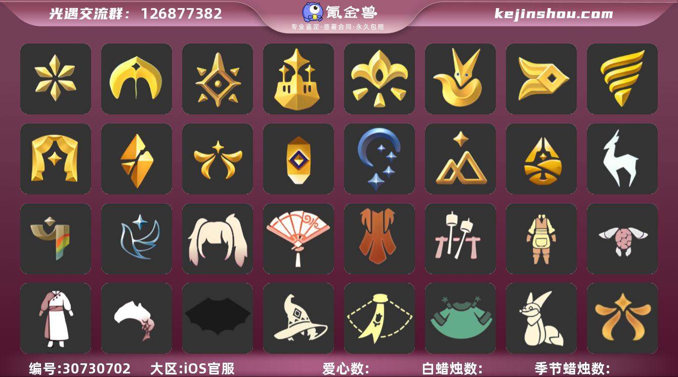 账号类型: 手机账号 季节已毕业: 音韵季,圣岛季,预言季,梦想季,小王子季,风行季,潜海季,表演季,破晓季,欧若拉季,集结季,夜行季,追忆季,拾光季,归巢季,九色鹿季,彩染季,青鸟季 完成地图: 晨岛,云野,雨林,霞谷,暮土,禁阁,全图毕业 珍稀物品: 阿努比斯(狗头),白枭,透明蝶翼斗,白鸟头,玫瑰花 礼包: 蝙蝠套,巫师,围巾,星球斗,小狐狸,欧若拉之翼,九色鹿角,莲花斗,音乐桌,大耳狗抱枕,大耳狗装扮,大耳狗服饰,绊爱,大铁头,鹿角,荷叶伞,蜘蛛斗,牛仔裤,兔子鞋,大耳狗发饰,肯德基联动,运动鞋,秋千,茶桌,茶壶,餐桌,白绒金,瑞雪,女巫裙,福娃,跷跷板,小船,吉他,灯笼,风之旅人,奔跑裤子,致爱装扮,人声乐器,奔跑发型,鲤鱼套,彩虹帽,雪花球,绒帽,橘子,粽叶,贝壳,黄伞,红伞,兔子,南瓜,枯角,雪花,鲤鱼,竖琴,手碟,tgc,水母,猫套,猫背饰,星月头饰,彩虹耳钉,彩虹耳机,雪怪斗,球赛门,新年裤,蝴蝶结,魔法棒,奥利奥,海螺,四叶草,暗彩装扮,向日葵套,小提琴,拖鞋,滑板,爱心眼镜,火焰眼镜,伯爵斗篷,透明蛛丝,伯爵面具,飞蛾套,文雀套,雪人鞋,夹袄斗,新年耳钉,龙纹斗,浪漫流星斗,创始人,海蓝波浪发型,蛛网朋克,龙鳞束身长袍,海龟斗篷,园丁装扮,献瑞折扇礼包,渐变双马尾发型礼包,篝火点心礼包,奉献斗篷 裤子: 武士裤,背带裤,白棉裤,搓澡巾 面具: 黄鼠狼,红狐狸,阿努比斯 面饰: 红耳机 项链: 围巾 发型: 蝴蝶结,正太,樱花,公主头,虚荣,猫耳,白鸟 头饰: 花环 斗篷: 白金,红金,白鸟斗,花瓣斗篷,荧蓝斗篷 配饰: 雨伞,排箫,高音钢琴,吉他,笛子,大铃铛乐器,乐器 亮点: 重塑药水57