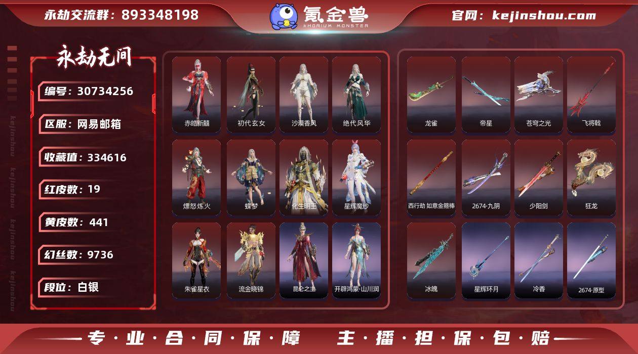 红皮数:19 黄皮数:441 收藏值:334616 幻丝数:9736 等级:323 三排段位:白银 通行证:未升级 赤皓新囍,初代玄女,沙漠香风,绝代风华,熛怒炼火,蝶梦,化生明王,星辉魔纱,朱雀星衣,流金晓锦 龙雀,帝星,苍穹之光,飞将戟,西行劫·如意金箍棒,2674·九阴,少阳剑,狂龙,冰魄 卖家说:精品号