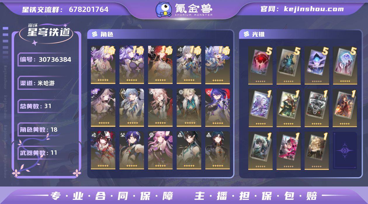 总黄数: 31 1命金色角色: 1命白露,1命姬子,1命布洛妮娅,1命黑天鹅,1命遐蝶 0命金色角色: 0命希儿,0命彦卿,0命瓦尔特,0命刃,0命丹恒•饮月,0命符玄,0命真理医生,0命花火,0命黄泉,0命砂金,0命椒丘,0命星期日,0命大黑塔 精5武器: 精5记忆的质料,精5孤独的疗愈,精5记一位星神的陨落,精5记忆永不落幕 精1武器: 精1如泥酣眠,精1以世界之名,精1比阳光更明亮的,精1游戏尘寰,精1行于流逝的岸,精1那无数个春天,精1让告别,更美一些