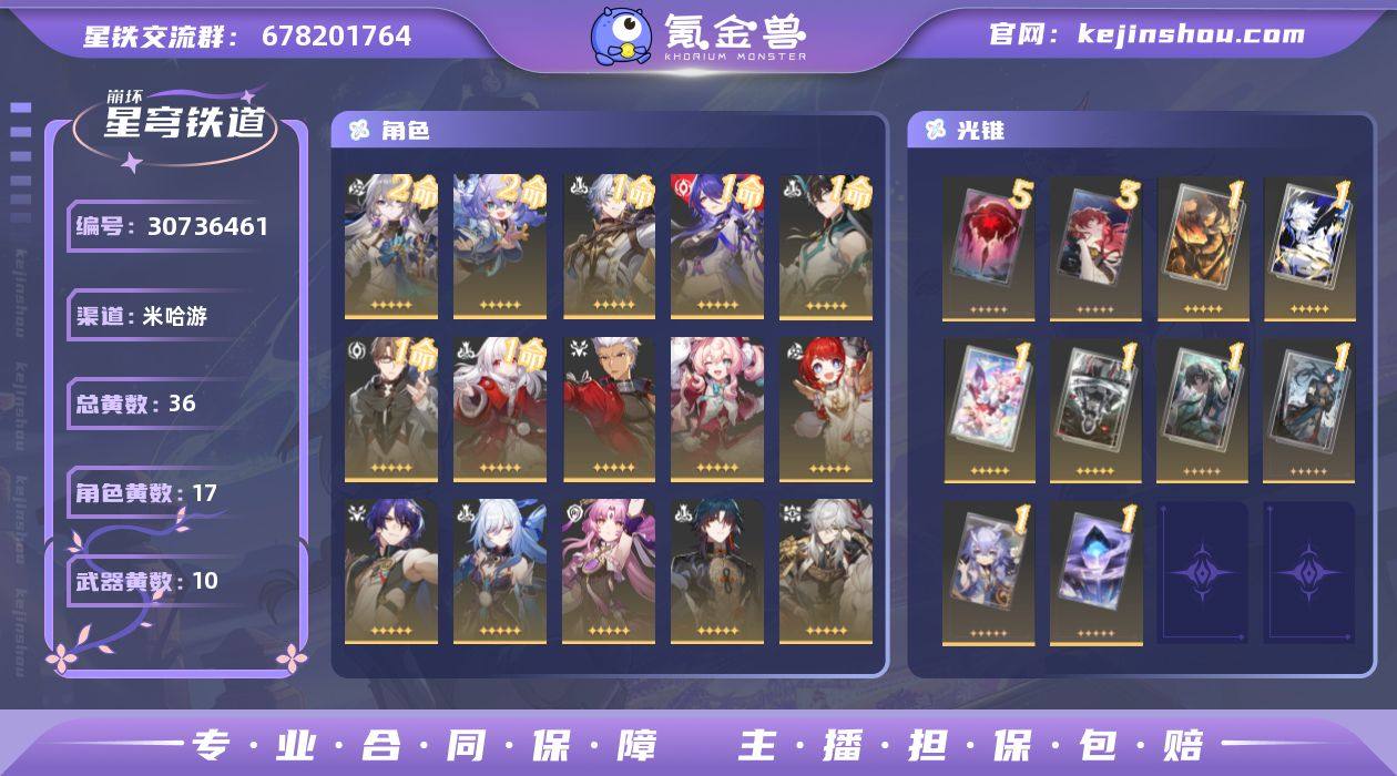 总黄数: 36 2命金色角色: 2命白露,2命布洛妮娅 1命金色角色: 1命瓦尔特,1命克拉拉,1命丹恒•饮月,1命黄泉,1命白厄 0命金色角色: 0命景元,0命姬子,0命杰帕德,0命刃,0命符玄,0命镜流,0命真理医生,0命缇宝,0命风堇,0命Archer 精5武器: 精5记一位星神的陨落 精3武器: 精3银河铁道之夜 精1武器: 精1时节不居,精1到不了的彼岸,精1比阳光更明亮的,精1记忆的质料,精1行于流逝的岸,精1愿虹光永驻天空,精1黎明恰如此燃烧,精1理想燃烧的地狱