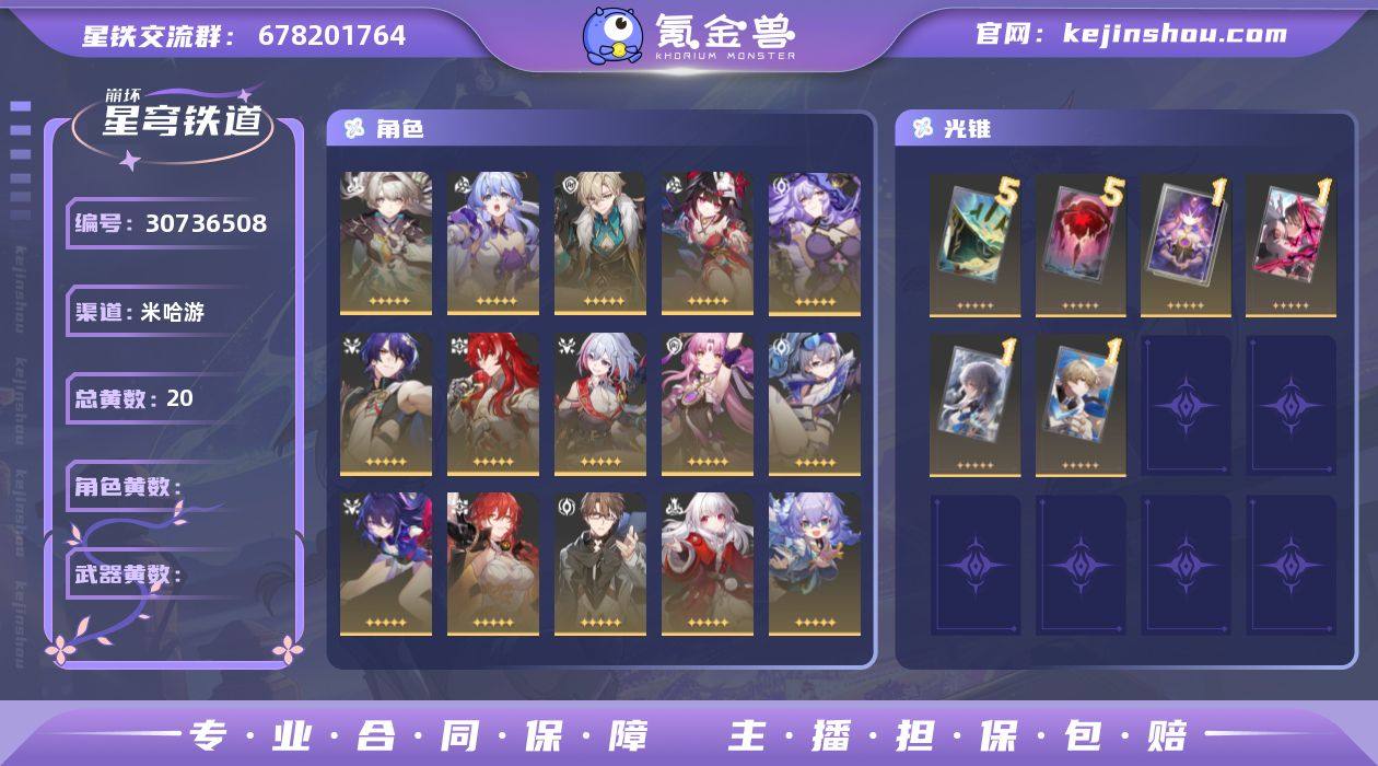 总黄数: 20 0命金色角色: 0命希儿,0命彦卿,0命白露,0命姬子,0命瓦尔特,0命克拉拉,0命银狼,0命符玄,0命托帕&账账,0命银枝,0命真理医生,0命黑天鹅,0命花火,0命砂金,0命知更鸟,0命流萤 精5武器: 精5记一位星神的陨落,精5星海巡航 精1武器: 精1制胜的瞬间,精1以世界之名,精1但战斗还未结束,精1她已闭上双眼