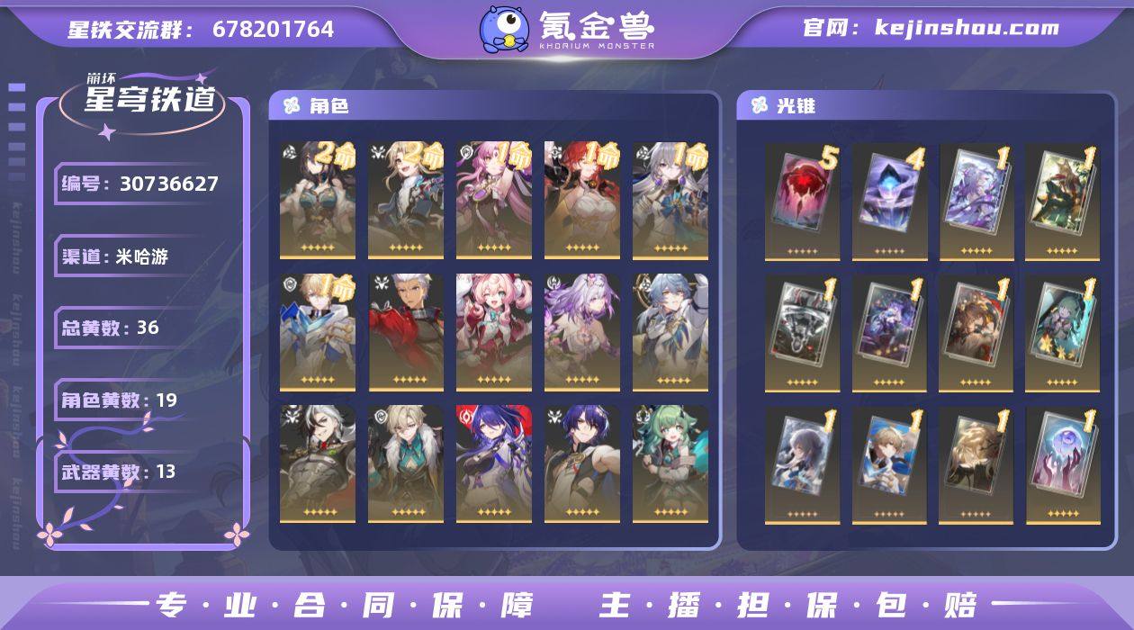 总黄数: 36 2命金色角色: 2命彦卿,2命阮•梅 1命金色角色: 1命姬子,1命布洛妮娅,1命杰帕德,1命符玄 0命金色角色: 0命景元,0命瓦尔特,0命克拉拉,0命罗刹,0命藿藿,0命真理医生,0命黄泉,0命砂金,0命波提欧,0命星期日,0命遐蝶,0命风堇,0命Archer 精5武器: 精5记一位星神的陨落 精4武器: 精4记忆的质料 精1武器: 精1如泥酣眠,精1制胜的瞬间,精1但战斗还未结束,精1惊魂夜,精1镜中故我,精1重塑时光之忆,精1行于流逝的岸,精1不息的演算,精1那无数个春天,精1记忆永不落幕,精1让告别,更美一些