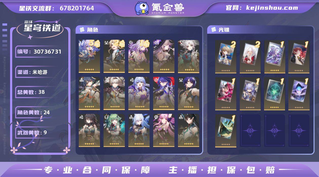 总黄数: 38 3命金色角色: 3命白露 2命金色角色: 2命彦卿 1命金色角色: 1命遐蝶 0命金色角色: 0命希儿,0命景元,0命姬子,0命瓦尔特,0命布洛妮娅,0命克拉拉,0命杰帕德,0命银狼,0命卡芙卡,0命丹恒•饮月,0命符玄,0命镜流,0命藿藿,0命阮•梅,0命真理医生,0命黄泉,0命知更鸟,0命流萤,0命飞霄,0命云璃,0命大黑塔 精2武器: 精2制胜的瞬间,精2无可取代的东西 精1武器: 精1时节不居,精1以世界之名,精1银河铁道之夜,精1记忆的质料,精1星海巡航,精1不息的演算,精1让告别,更美一些